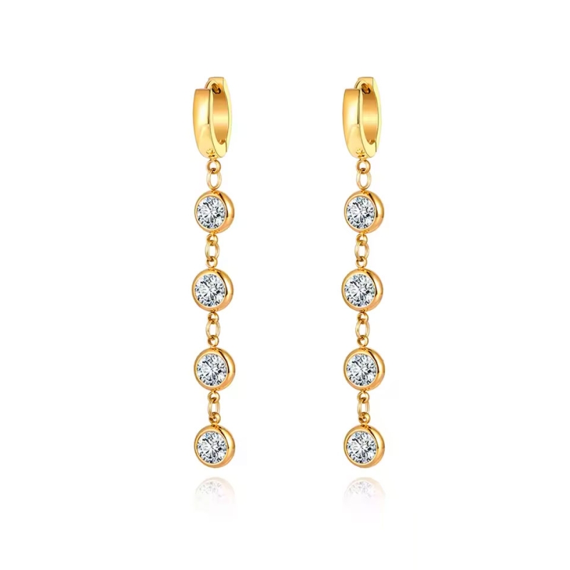 Zářivé visací náušnice v teplém odstínu zlata se stanou nepřehlédnutelným doplňkem každé ženy, která miluje eleganci a třpyt. Čtveřice jemně broušených zirkonů je zasazena v kulatých lůžkách a zavěšena do lehce pohyblivé linie, která se při každém kroku jemně chvěje a odráží světlo. Náušnice se zapínají na pohodlný kroužek, který zajišťuje snadné nasazení i bezpečné nošení po celý den.Kombinace kvalitní chirurgické oceli s PVD úpravou ve zlaté barvě a precizně vybroušených zirkonů vytváří nadčasový šperk vhodný pro každou příležitost. Díky univerzální délce opticky prodlužují krk a zvýrazňují ženské rysy. Zároveň působí decentně, a proto je můžete s lehkostí sladit s dalšími zlatými doplňky nebo s jemným make-upem.Tyto náušnice oceníte nejen pro jejich oslnivý vzhled, ale i pro vysokou odolnost a hypoalergenní vlastnosti. Skvěle se hodí jako dárek pro výjimečné ženy – ať už k narozeninám, výročí, nebo jen tak pro radost. Stačí je jen vložit do dárkové krabičky a vykouzlíte úsměv během několika vteřin. 💡 Tip: Pokud chcete vytvořit harmonický a luxusní look, zkombinujte náušnice s minimalistickým zlatým náhrdelníkem nebo jemným náramkem s krystaly. Vyniknou jak při slavnostních příležitostech, tak při večerním posezení s přáteli.
