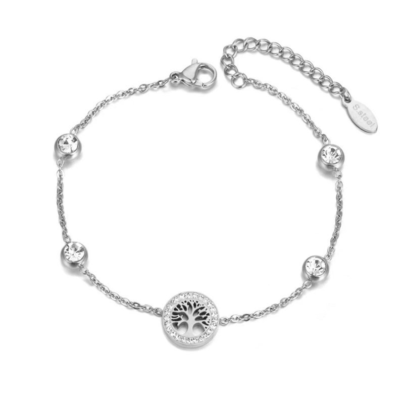 Stylový ocelový náramek Magda, ozdoben čirými zirkony a ocelovými ozdobami v podobě Stromu života, je rafinovaným doplňkem pro každou ženu. Využijte tento nadčasový kousek do společnosti nebo i na každodenní nošení. Dopřejte si moderní styl a eleganci v jednom.