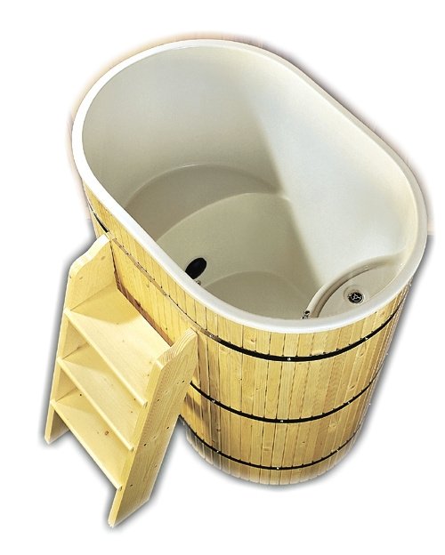 Ochlazovací káď LUXOR s laminátovou vložkou v bílé barvě vč. smrkového obložení. Součástí je sedačka, přelivový žlábek, táhlo na ovládání výpusti. Káď neobsahuje schůdky ani napouštěcí trysku. Rozměry (délka/šířka/výška): 101x68x108 cm.