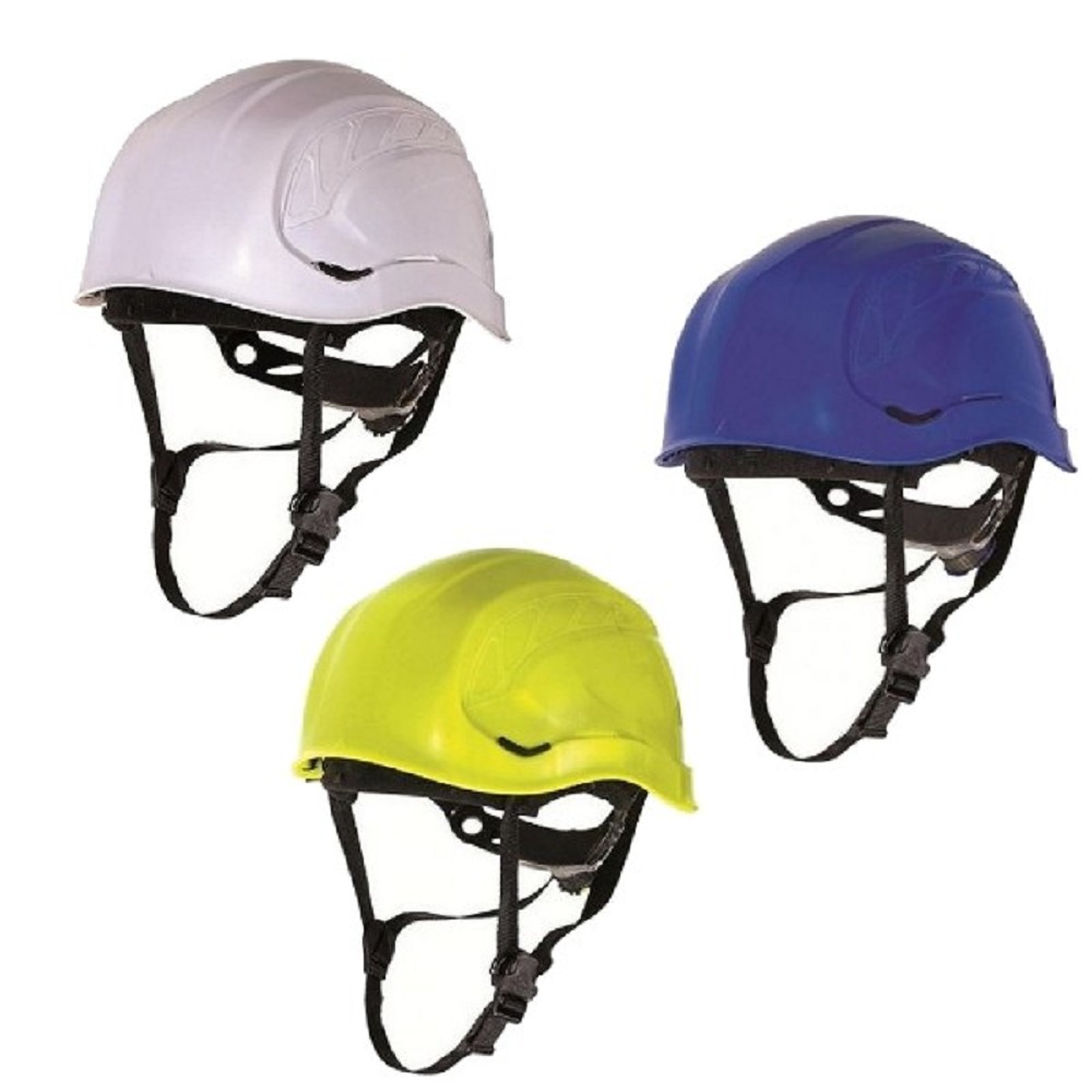 Ochranná přilba GRANITE PEAK bílá, modrá, žlutá Ochranná přilba z polykarbonátu. Přilba ve stylu Mountain: bez kšiltu pro nejlepší vertikální výhled. Malé zatížení. Lehká. Nové textilní pásky pro větší pohodlí. Potní páska. Inovativní systém ROTOR ® nastavení velikosti (patentováno): na velikost hlavy 53 až 63 cm. Prodává s podbradníkem se 3 upevňovacími body. Speciálně konstruovaná pro práci ve výškách. Elektrická izolaci až do 1 000 V a.c. nebo 1 500 V D.C. Barva -zářivě modrá, bílá, zářivě žlutá