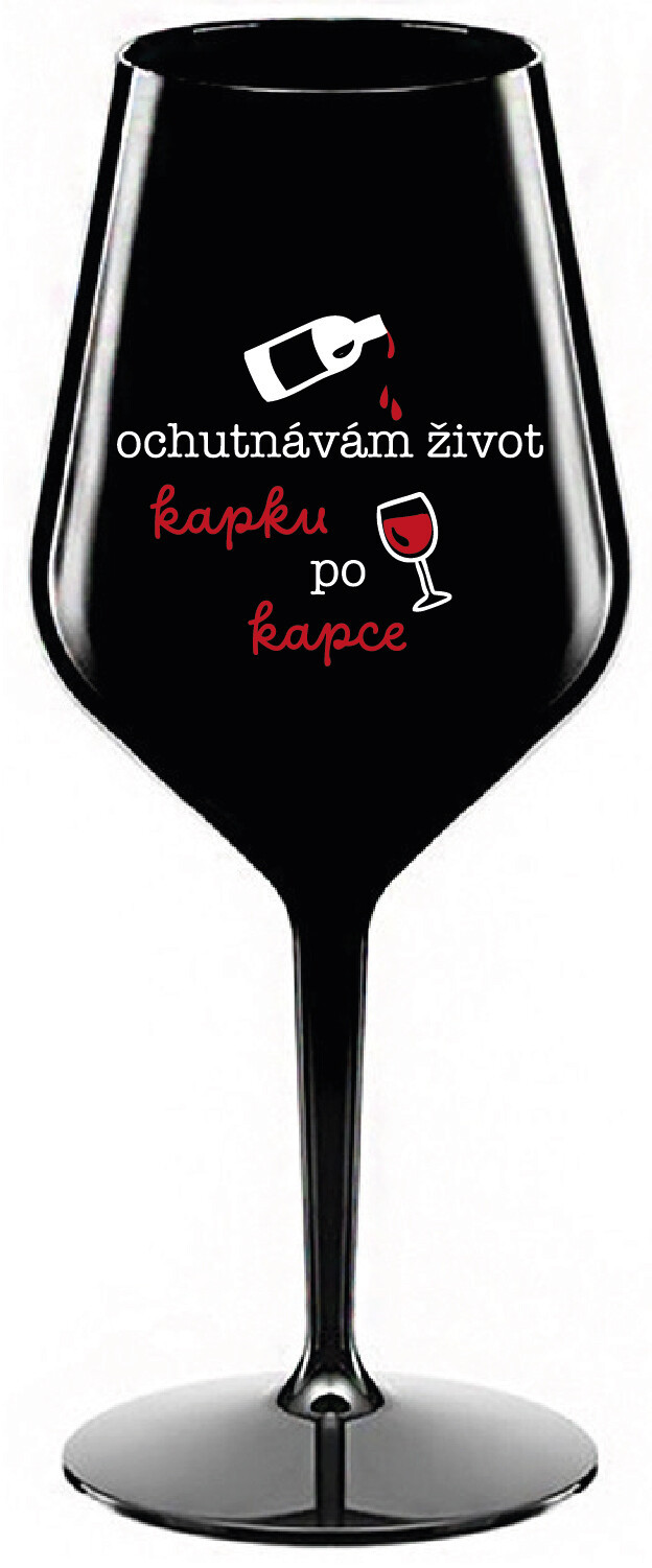 Nerozbitná černá vinná sklenice s motivem OCHUTNÁVÁM ŽIVOT KAPKU PO KAPCE je skvělá na zahradu, pláž, výlet, piknik a parádu udělá i při kempování. Jelikož je vyrobená z kvalitního polykarbonátu je de facto nerozbitná. Je to luxusní kousek, s nímž si víno můžete vychutnat prostě kdekoliv. Mají ergonomický tvar, který příjemně padne do ruky a protože je lehká, usnadňuje to její přenášení. Je snadno skladovatelná a lehce se čistí. Díky svému designu si s ní můžete vychutnat doopravdy kdekoliv bezproblémové pití výborného vína. Materiál PP. Vyrobené s láskou v ČR