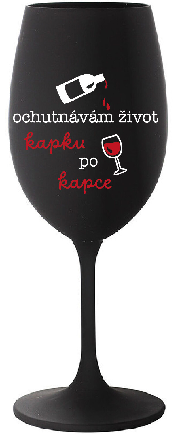 Vinná černá sklenice s originálním motivem OCHUTNÁVÁM ŽIVOT KAPKU PO KAPCE je krásným a osobitým dárkem, které ale využijete i Vy sami třeba ve chvílích, kdy si budete chtít zpříjemnit náročný den. Tyto originální vinné sklenice jsou totiž nejen pro výjimečné události, ale i pro běžné večery, které si chcete zpříjemnit sklenkou dobrého vína. Jistě proto potěší každého milovníka vína, i toho, kdo si umí svůj život vychutnat plnými doušky. Materiál sklo. Vyrobené s láskou v ČR