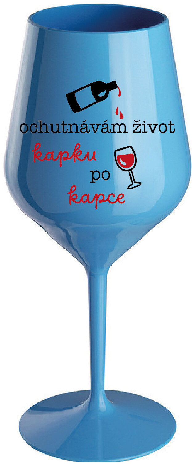 Nerozbitná modrá vinná sklenice s motivem OCHUTNÁVÁM ŽIVOT KAPKU PO KAPCE je skvělá na zahradu, pláž, výlet, piknik a parádu udělá i při kempování. Jelikož je vyrobená z kvalitního polykarbonátu je de facto nerozbitná. Je to luxusní kousek, s nímž si víno můžete vychutnat prostě kdekoliv. Mají ergonomický tvar, který příjemně padne do ruky a protože je lehká, usnadňuje to její přenášení. Je snadno skladovatelná a lehce se čistí. Díky svému designu si s ní můžete vychutnat doopravdy kdekoliv bezproblémové pití výborného vína. Materiál PP. Vyrobené s láskou v ČR