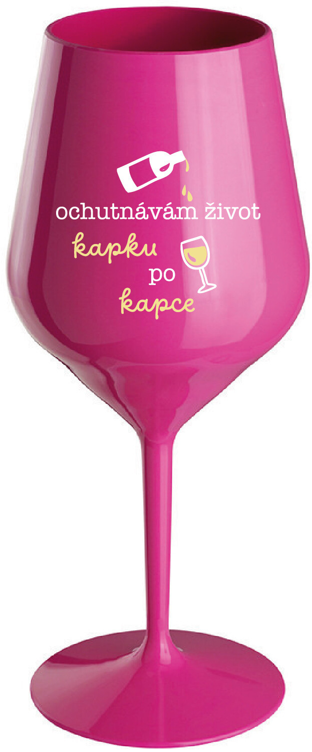 Nerozbitná růžová vinná sklenice s motivem OCHUTNÁVÁM ŽIVOT KAPKU PO KAPCE je skvělá na zahradu, pláž, výlet, piknik a parádu udělá i při kempování. Jelikož je vyrobená z kvalitního polykarbonátu je de facto nerozbitná. Je to luxusní kousek, s nímž si víno můžete vychutnat prostě kdekoliv. Mají ergonomický tvar, který příjemně padne do ruky a protože je lehká, usnadňuje to její přenášení. Je snadno skladovatelná a lehce se čistí. Díky svému designu si s ní můžete vychutnat doopravdy kdekoliv bezproblémové pití výborného vína. Materiál PP. Vyrobené s láskou v ČR