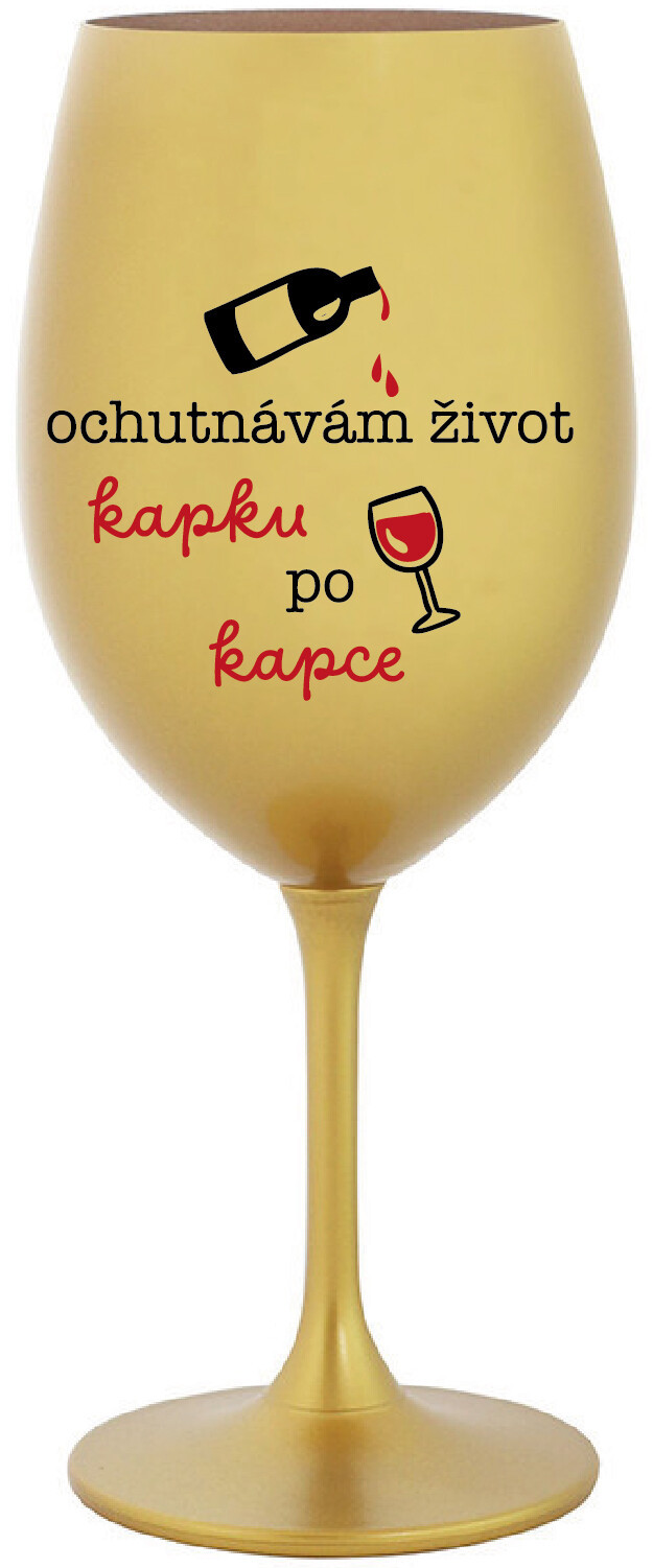 Vinná zlatá sklenice s originálním motivem OCHUTNÁVÁM ŽIVOT KAPKU PO KAPCE je krásným a osobitým dárkem, které ale využijete i Vy sami třeba ve chvílích, kdy si budete chtít zpříjemnit náročný den. Tyto originální vinné sklenice jsou totiž nejen pro výjimečné události, ale i pro běžné večery, které si chcete zpříjemnit sklenkou dobrého vína. Jistě proto potěší každého milovníka vína, i toho, kdo si umí svůj život vychutnat plnými doušky. Materiál sklo. Vyrobené s láskou v ČR