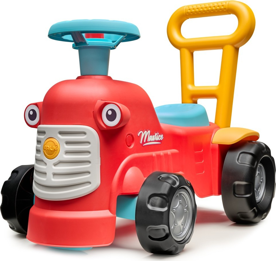 Odstrkovadlo – traktor „Maurice“ červený s volantem, klaksonem a ergonomickou opěrkou při chůzi. Vybeno ve Francii z vysoce oddoleného a kvalitního z 50% recyklovaného plastu. Testováno dle evropských norem na hnotnost 30 kg. Rozměry odrážedla 57×31×45 cm.