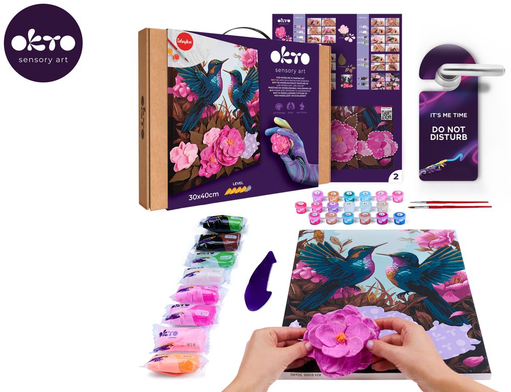OKTO Malba a 3D modelování obraz "Hummingbirds in Love". OKTO Malba a 3D modelování obraz ""Zamilovaní kolibříci"" 30x40 cm. Obsah balení - plátno, obrázkový návod, modelovací nástroj, Sada samoschnoucí modelovací hmoty, set barev na malování, štětec