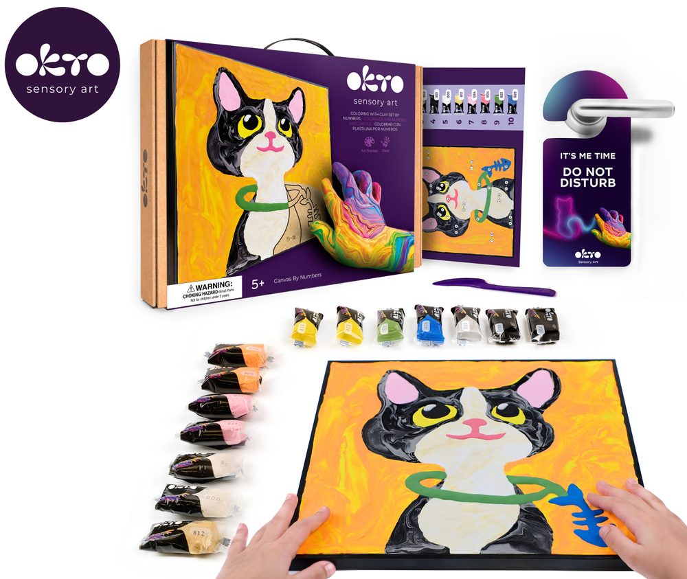 OKTO Malování hmotou podle čísel "Kočka" OKTO Malování hmotou podle čísel ""Kočka"" 29x29 cm. Obsah balení - rám, plátno, obrázkový návod, modelovací nástroj, sada barevých tvarovacích směsí 14 ks.