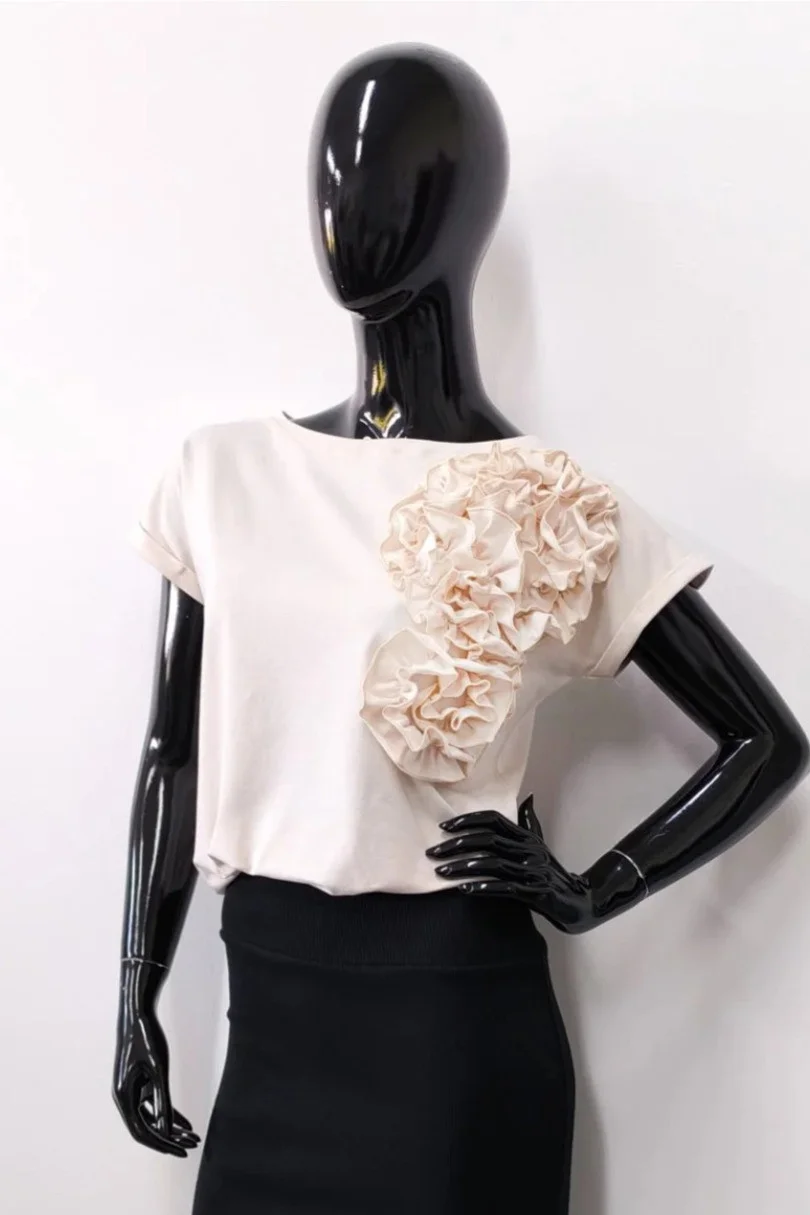 Dodaj do swojej garderoby nutę elegancji i kobiecego uroku dzięki tej wyjątkowej bluzce damskiej z krótkim rękawem. Jej klasyczny krój z nowoczesnym akcentem – wywijany rękaw i wydłużony, lekko zaokrąglony tył – sprawia, że idealnie sprawdzi się zarówno na co dzień, jak i w bardziej formalnych stylizacjach. Prawdziwą ozdobą są przestrzenne kwiaty 3D, które nadają całości modnego i oryginalnego charakteru. Wykonana z miękkiej, oddychającej bawełny z dodatkiem elastanu, gwarantuje komfort noszenia i dopasowanie do sylwetki.