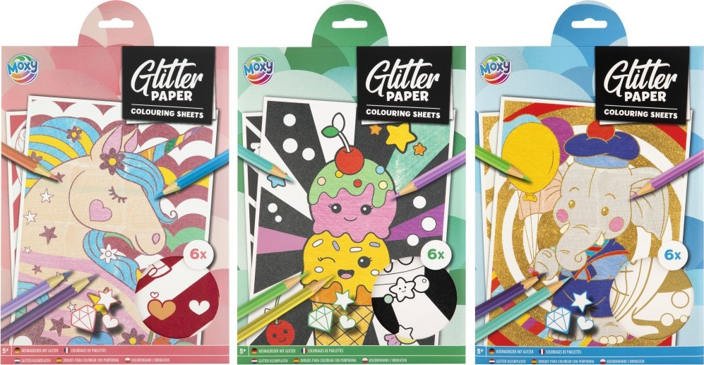 Omalovánky třyptivé A4 – balení obsahuje 6 listů třpytivých omalovánek velikosti A4, ve třech různých druzích .