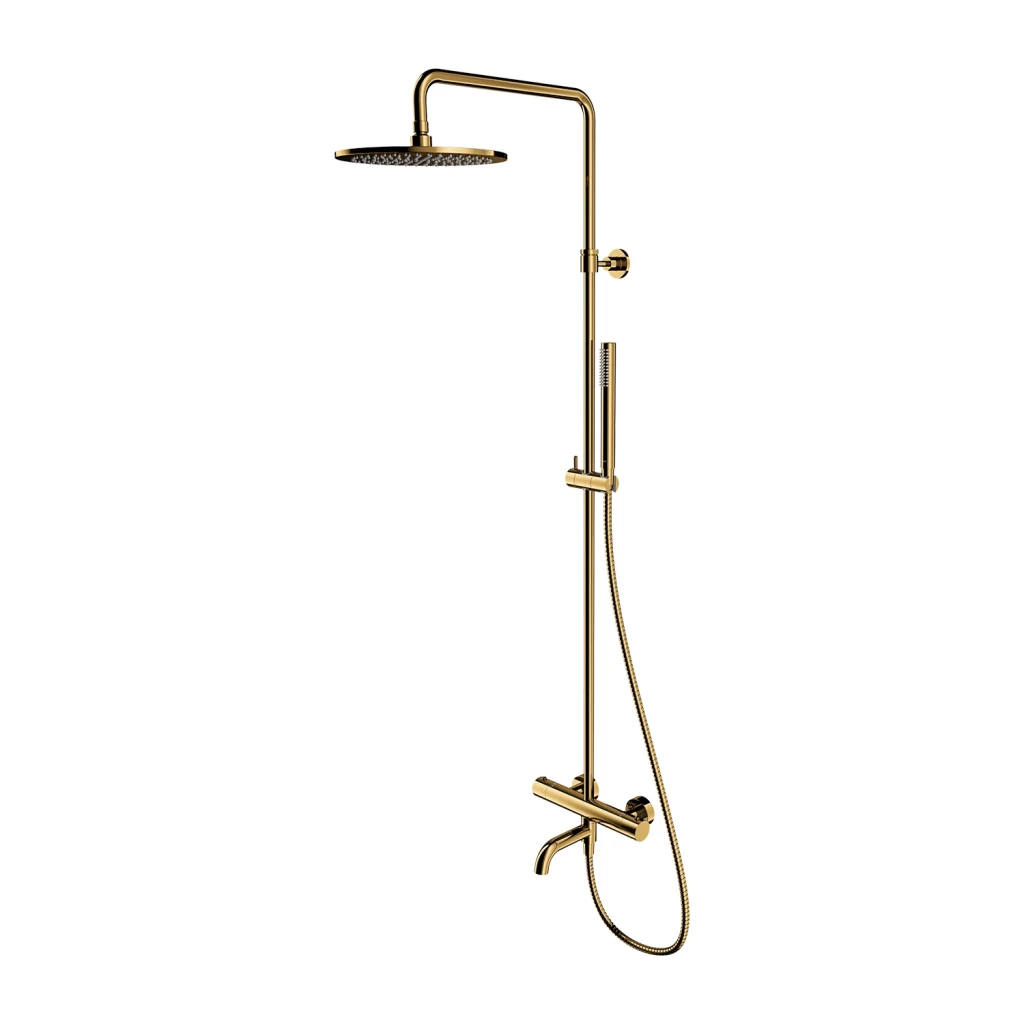 Kolekce OMNIRES Y potěší svými čistými liniemi a dokonalou formou, která je výrazem vášně ve snaze o ideál. Inspirací a základem pro návrh byl tvar kruhu. Nadčasový, dokonale zpracovaný design vytvořený v duchu minimalismu nabízí maximální možnosti aranžmá. Zlatý, dokonale hladký povrch výrobku je ušlechtilý povrch s elegantním, jasným odstínem. Povlak byl vyroben pomocí pokročilé technologie PVD. termostatická vanová baterie uzávěr teplé vody na 38°C mosazná dešťová sprcha, rozměr: ø25cm, dosah od stěny: 42 cm rozsah sklopného výtoku: 20,6 cm sprchové madlo ( MICROPHONEX-RGL ), 1-funkce sprchová hadice v ocelovém pouzdře dešťová sprcha/ruční spínač trysky zabudovaný do knoflíku pro nastavení vody nastavitelná výška, min/max výška systému: 113,5 cm/152 cm