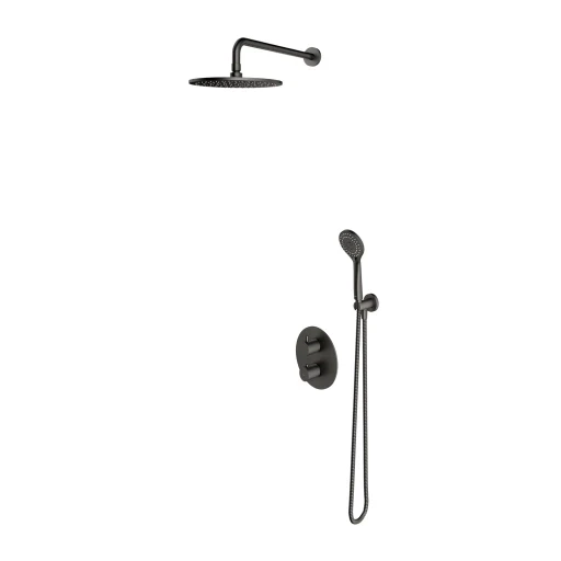 Kolekce OMNIRES Y zaujme svou čistou linií a bezchybnou formou, která je vyjádřením vášně v úsilí o ideál. Inspirací a základem pro projekt byl tvar kruhu. Nadčasový, dokonale propracovaný vzor vytvořený v duchu minimalismu poskytuje maximální aranžmánské možnosti. Grafit je zajímavá povrchová úprava v odstínu metalické šedé se saténovým, kartáčovaným povrchem. Design: Janusz Langner, Studio OMNIRES povrchově montovaný prvek pro podomítkovou termostatickou sprchovou/vanovou baterii ( Y1236ROGR ) podomítkový prvek pro termostatickou sprchovou/vanovou baterii se 2 výstupy ( BOXTE2F ) Mosazná dešťová sprcha s ramenem ( WGSET1GR ), rozměr: ø25 cm, dosah od zdi: 41 cm sprchová rukojeť ( YOSEMITE-RGR ), 5funkční sprchová hadice s mosazným krytem ( 029GR ), délka: 150 cm Mosazná úhlová spojka ( 8873GR ), s držákem sprchové rukojeti