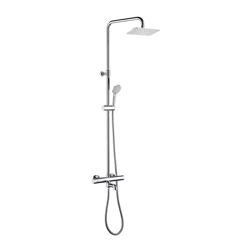 termostatická vanová baterie zámek horké vody při 38 °C Systém chlazení těla baterie zabraňuje popáleninám v případě náhodného kontaktu Dešťová sprcha z nerezové oceli (WGU220CR), rozměr: 20x20 cm, dosah od zdi 42 cm ruční sprcha (YOSEMITE-RCR), 5 funkcí, typ trysky: masážní, mlha, provzdušněný déšť, provzdušněná masáž, provzdušněná mlha sprchová hadice s kovovým krytem, délka: 150 cm Přepínač dešťové sprchy/trysků zabudovaný v knoflíku pro regulaci vody nastavitelná výška, min./max. výška systému ~98 cm/~128 cm