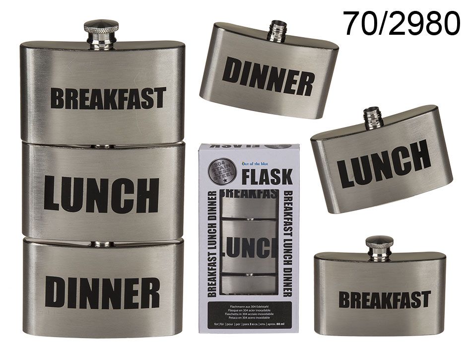 Tento stylový a vtipný set tří placatek přináší nový rozměr každodenním rituálům. Každá placatka je označena nápisem "Snídaně", "Oběd" a "Večeře", což z ní dělá skvělý dárek pro přátele, kolegy nebo členy rodiny. Díky kompaktní velikosti se snadno vejde do kapsy či kabelky a stane se skvělým společníkem na cesty, festivaly nebo oslavy. Vyrobeno z kvalitního materiálu, který zajistí dlouhou životnost a pohodlné používání.