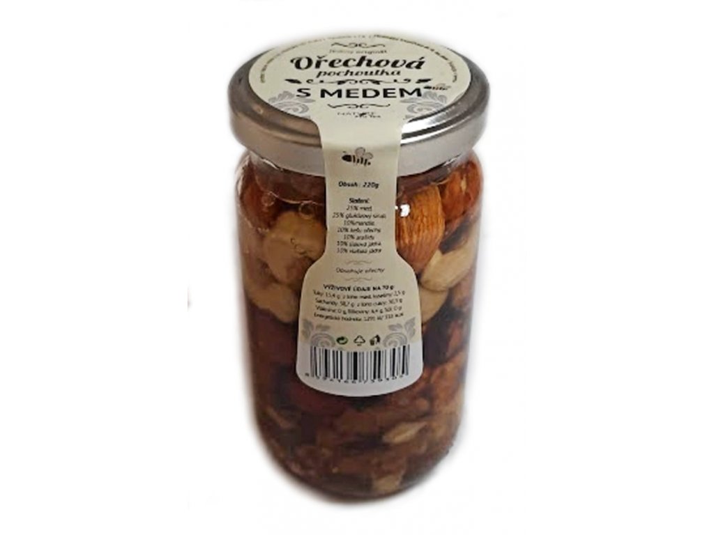 OŘECHY S MEDEM - MIX OŘECHŮ 220 G Vychutnejte si smyslnou kombinaci vybraných ořechů a průzračného lipového medu. Oříšky v medu jsou vhodné nejen do balíčků, ale i jako drobná svačinka, dezert k odpolední kávě nebo třeba na mlsání do práce. Chuť oříšků v medu si určitě zamilujete! Složení: 10 % mandle, 10 % kešu, 10 % vlašské ořechy, 10 % arašídy, 10 % lískové ořechy, 25 % glukózový sirup, 25 % lipový med