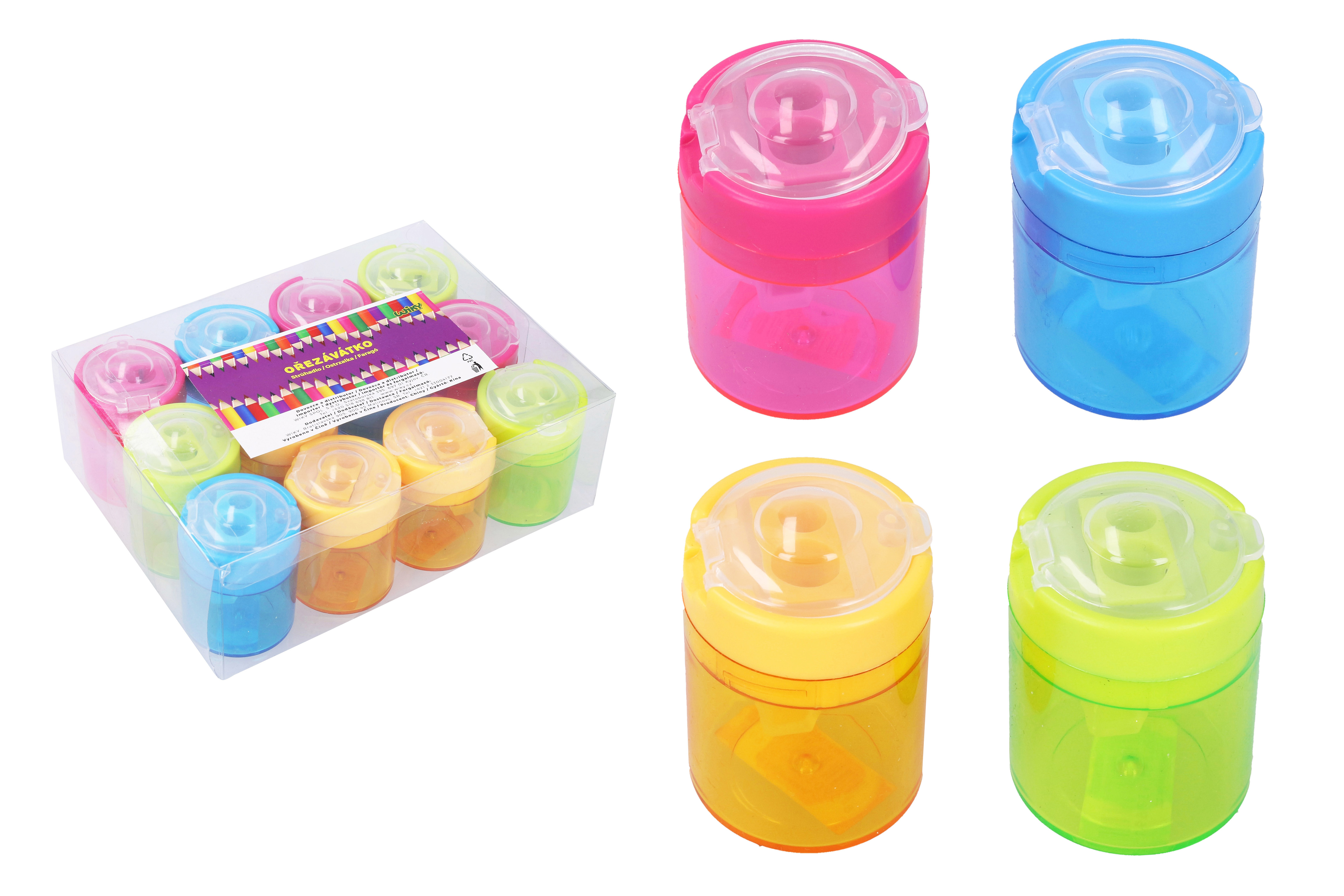 Ořezávátko na dvě tužky o velikosti 4x4x5,6 cm se zásobníkem. 4 barevné provedení. 12 ks v boxu.