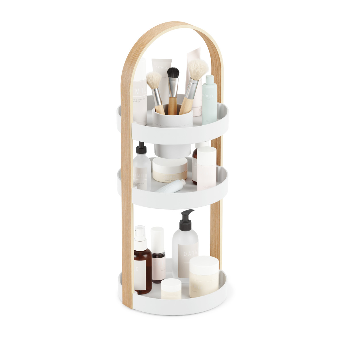 Umbra Bellwood Cosmetic Organizer je moderní a elegantní řešení pro přehledné uložení kosmetiky, parfémů i drobných doplňků. Nabízí tři prostorné patra, která poskytují dostatek místa pro vaše oblíbené produkty, aniž by zabírala zbytečně mnoho prostoru na toaletním stolku či koupelnové desce. Díky integrovanému dřevěnému madlu se snadno přenáší a odnímatelný kelímek umožňuje pohodlné uložení štětců, tužek nebo kosmetických nástrojů. Bellwood spojuje krásu přírodního dřeva s funkčností moderního plastu a díky svému čistému designu se stane stylovým doplňkem každého interiéru.