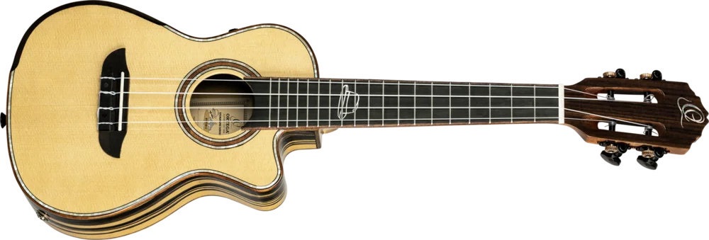 Elektroakustické ukulele Elektroakustické ukulele koncertní velikosti Billy Watman BYWSM-U značky Ortega je signature model známého hráče na klasickou i akustickou kytaru, který v hudbě spojuje latinskoamerické kořeny s vlivy klasické hudby, rocku a popu. Přední deska ukulele je zhotovena z masivu smrku, zadní deska a luby jsou vyrobeny z ručně vybraného vrstveného ebenu (Pale Moon Ebony). Exkluzivní kresbu bílého ebenu zvýrazňuje lak rozleštěný do vysokého