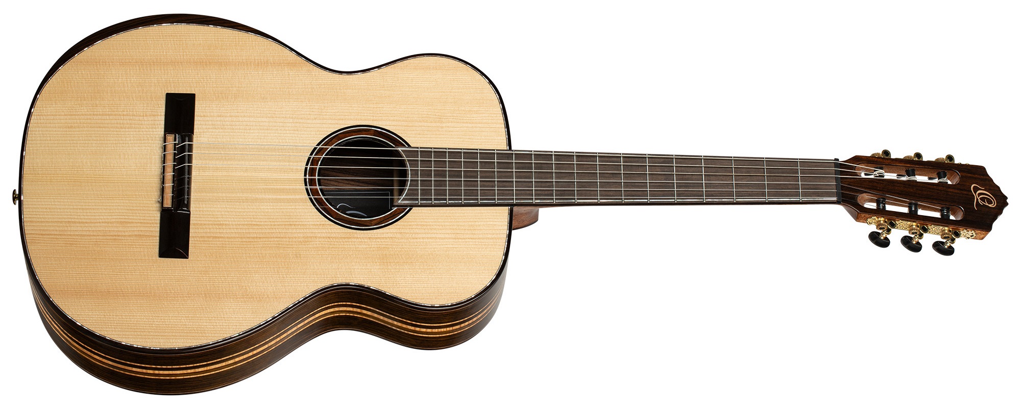 Klasická kytara Řada Private Room značky Ortega nabízí kvalitně zpracované polomasivní klasické kytary z ručně vybraných materiálů (dřev), které stále pořídíte za velmi dostupnou cenu. Užší krk (šířka nultého pražce 48 – 50 mm) ocení hráči s drobnějšími prsty, ale i muzikanti zvyklejší na rozměry krku akustických kytar. Přední deska klasické kytary Grandsuite 4/4 NAT je zhotovena z masivu evropského smrku. Zadní desku a luby z vrstveného palisandru dekorují proužky z fládrovaného javoru. Mnozí jistě ocení i