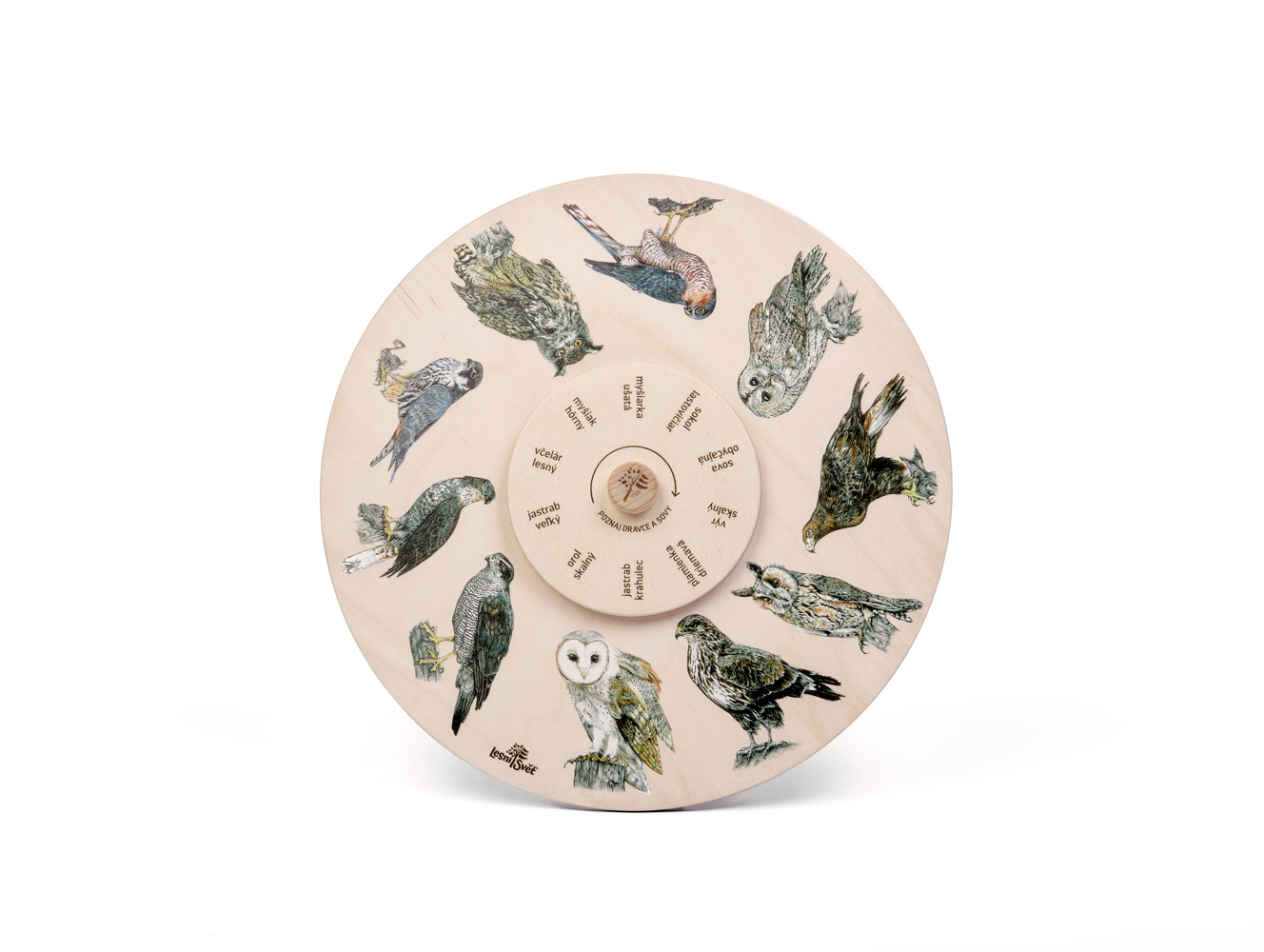 Otočné koleso vyrábajú v našej dielni české ruky z kvalitného českého certifikovaného dreva. Balenie obsahuje 1 koleso. Priemer kolesa je 25 cm. Nemá ochranný obal. Autori kresieb sú českí ilustrátori, obrázky sú chránené autorskými právami. Otočné koleso zábavnou a hravou formou zoznamuje deti aj dospelých s prírodou. Správnym otočením kolesa priradíte názov k obrázkom dravcov a sov. Lesný svet = značka s ekologickým certifikátom udržateľného hospodárstva PEFC. Všetky produkty sú vyrobené s ohľadom na životné prostredie.