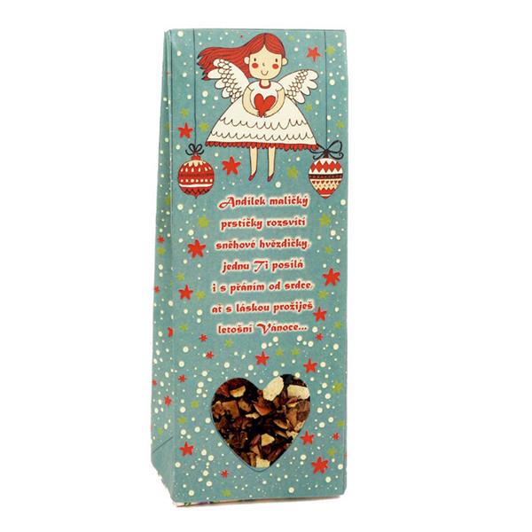 Ovocný čaj v dárkové krabičce s motivem roztomilého andílka se srdíčkem Text: Andílek maličký prstíčky rozsvítí sněhové hvězdičky, jednu Ti posílá i s přáním od srdce, ať s láskou prožiješ letošní Vánoce... Sypaný ovocný čaj aromatizovaný 50g 2 čajové lžičky zalijte 2,5 dl vroucí vody, ponechte 8 - 10 minut louhovat Země původu: Česká republika