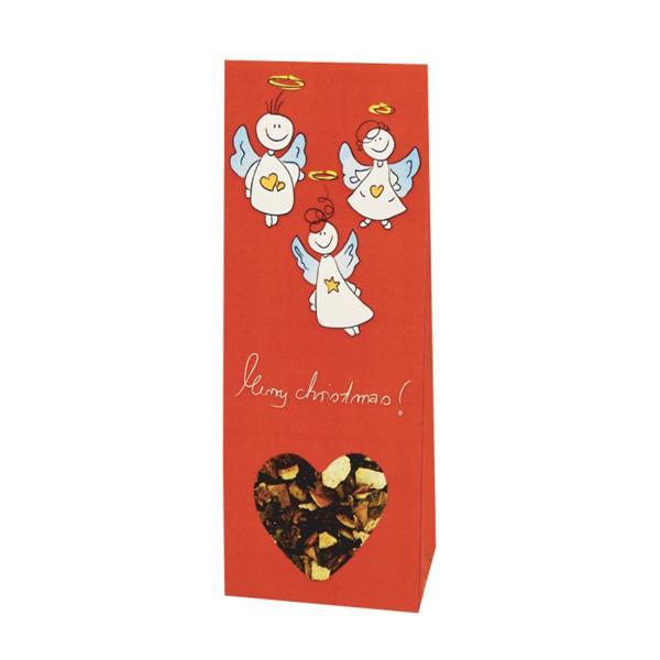 Aromatizovaný sypaný ovocný čaj ve vánočním balení s motivem šťastných andílků 50g Složení: šípky, ibišek, jablko, pomerančová kůra, rozinky, květy růže, smil písečný, hřebíček, kardamon, aroma