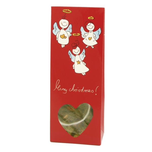 Krásné vánoční balení pyramidového čaje s motivem šťastných andílků Balení 10x3g Text: Merry Christmas! Obsah: ovocný čaj v pyramídových sáčcích aromatizovaný Příprava: 1 sáček čaje zalijeme 2,5 dl horké vody, 8-10 minut necháme louhovat. Po přecezení podáváme.