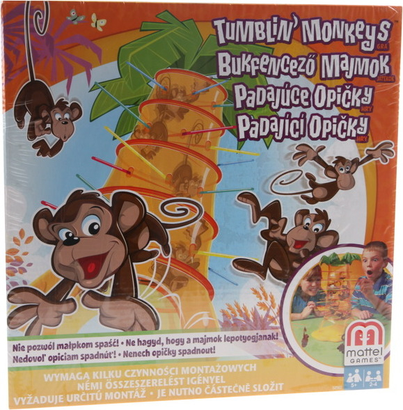 Jedinečná zručnostní hra Padající opičky lehce připomíná klasickou hru Mikádo. Úkolem je odebírat tyčky tak, aby opičky nepropadávaly. Nejprve si postavíte strom, nastrkáte tyčky libovoně do předem připravených otvorů a spustíte opičky do útrob stromu. Ty se zachytí svými ocásky za připravené tyčky. Následně házíte barevnou kostkou, která určuje jakou tyčku musíte vytáhnout. To musíte udělat tak, aby Vám propadlo co nejméně opiček. Chytlavá hra plná zábavy. Obsah hry: 1 strom. 30 opiček. 30 tyček ve 3 barvách. 1 kostka. Návod ke hře. Počet hráčů: 2–4 hráči. Doba hraní: 30 minut.