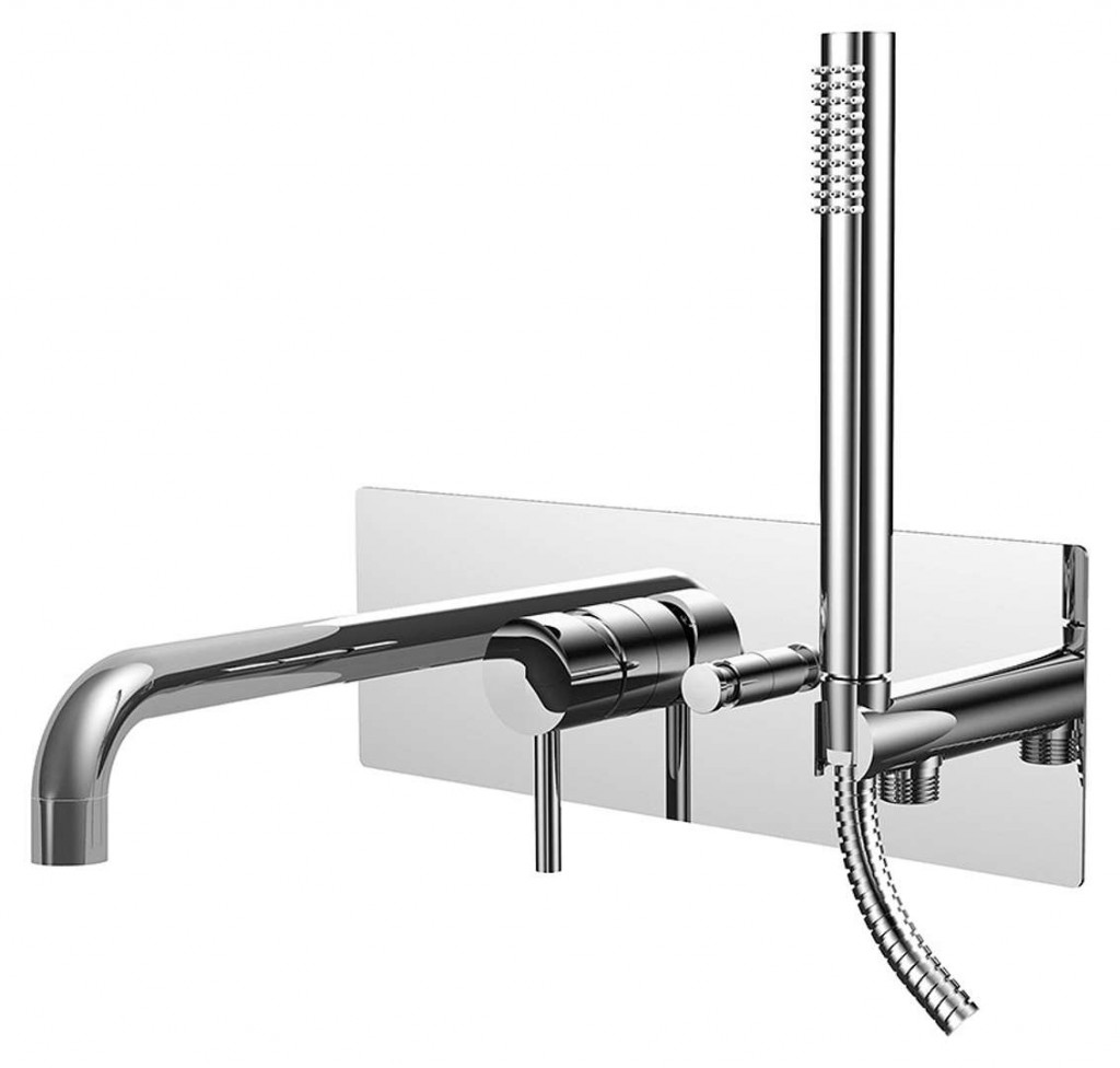 Podomítková vanová baterie s montážním tělesem barva chrom s tlakovým přepínačem pro 2 výstupy pákové ovládání nerezová nástěnná deska 350 x 120 mm vanový výtok, perlátor M18x1,5 tyčová sprchová hlavice s 1 proudem flexibilní sprchová hadice nerezová krycí rozeta připojení: G 1/2" instalační těleso je součástí baterie
