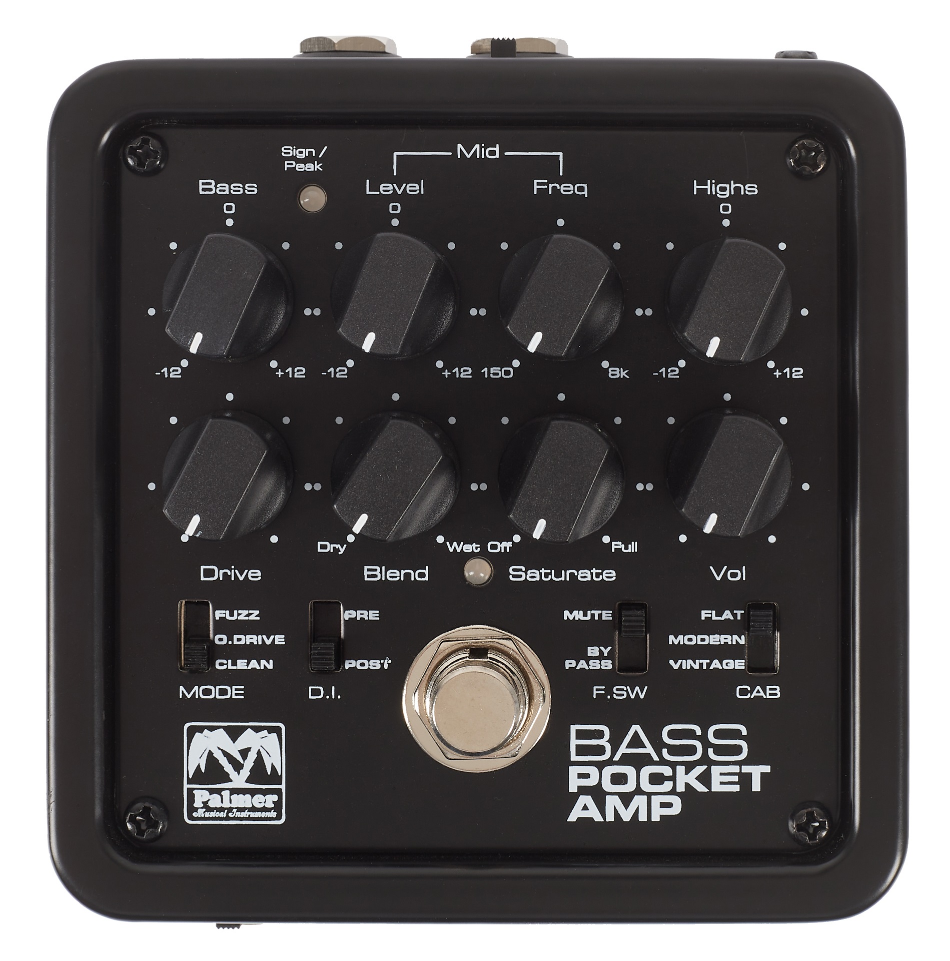 Baskytarový předzesilovač a DI Box Kapesní baskytarový předzesilovač Pocket Amp Bass od společnosti Palmer se stane vaším věrným pomocníkem při koncertování, nahrávání ve studiu i domácím cvičení. Je přizpůsoben pro aktivní i pasivní baskytary a nabízí tři zvukové režimy – Clean, Overdrive a Fuzz. Zvuk lze dále upravovat pomocí ovladačů Drive a Saturation, s nimiž si nastavíte míru a charakter zkreslení. Potenciometr Blend vám umožní nastav