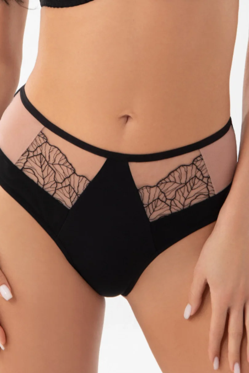 Średni stan. Odsłaniają i podkreślają pośladki. Wykonane z microfibry połączonej z elastycznym tiulem oraz haftem podbitym tiulem stabilnym.Tył to połączenie czarnego i transparentnego tiulu tworzące fantazyjny kształt. Tył z tiulu elastycznego wykończony na gładko, tak aby majtki nie odznaczały się pod ubraniem. Bawełniany kroczek. Skład: 90% Poliamid, 7% Elastan, 3% Poliester