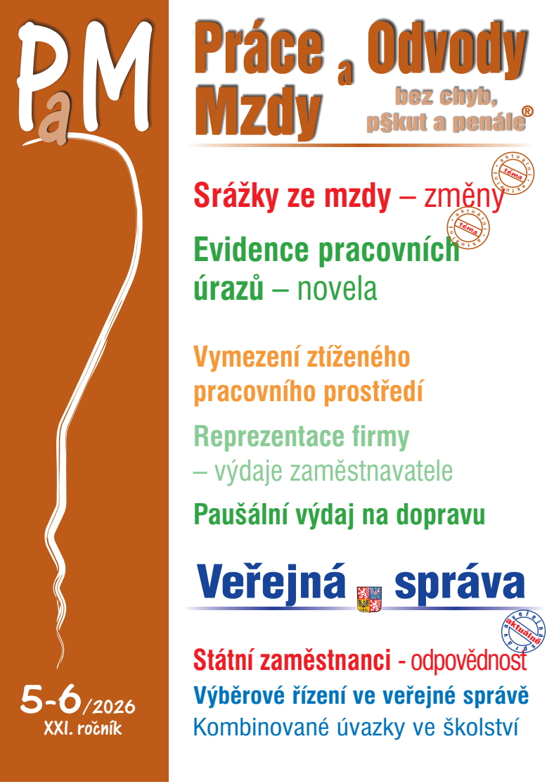 Změny srážek ze mzdy - Přinášíme přehled změn (včetně návodů, příkladů a upozornění pro praxi) v oblasti exekučních srážek ze mzdy nejen účinných od 1. 1. 2026, ale též i skutečně v praxi uplatňovaných od 1. 1. 2026, což dříve nebylo totéž. Změn je vícero. Nezabavitelná částka na povinného dlužníka činí 85 % součtu částek 9 430 Kč + 2 300 Kč + 4 860 Kč čili 85 % ze 16 590 Kč, což je 14 101,50 Kč.Titul obsahuje:Měsíčník obsahuje aktuální příspěvky doplněné o příklady z praxe a aktuální judikaturu. Je rozdělen na rubriky: Aktuálně, Pracovní právo, Chyby a pokuty, Judikatura, Pracovní cesta, Automobil v podnikání, Odvody, Veřejná správa, Vzory smluv, Výdaje zaměstnavatele, Vedoucí pracovník …- Změny srážek ze mzdy- Zaměstnávání cizinců- Více zaměstnání a postupy zaměstnavatele ve zdravotním pojištění - po změnách- Zapůjčení zaměstnance jinému zaměstnavateli- Vymezení ztíženého pracovního prostředí – změny- Evidence pracovních úrazů – změny- Ochrana zdraví zaměstnance- Možnost snížení daně a odvodů u podnikajících zaměstnanců (2.)- Minimum zaměstnavatele ve zdravotním pojištění- Výdaje zaměstnavatele na reprezentaci firmy- „Kárná odpovědnost“ státních zaměstnanců- Výběrové řízení ve veřejné správě- Kombinované úvazky ve školstvíZměny srážek ze mzdyPřinášíme přehled změn (včetně návodů, příkladů a upozornění pro praxi) v oblasti exekučních srážek ze mzdy nejen účinných od 1. 1. 2026, ale též i skutečně v praxi uplatňovaných od 1. 1. 2026, což dříve nebylo totéž. Změn je vícero. Nezabavitelná částka na povinného dlužníka činí 85 % součtu částek 9 430 Kč + 2 300 Kč + 4 860 Kč čili 85 % ze 16 590 Kč, což je 14 101,50 Kč.Zaměstnávání cizincůZáklad právní úpravy zaměstnávání zaměstnanců ze zahraničí (cizinců) obsahuje zákon č. 435/2004 Sb., o zaměstnanosti v části čtvrté, v ustanovení § 85 až § 103 ZZ. Na rozdíl od občanů Evropské unie a jejich rodinných příslušníků neposkytuje zákon o zaměstnanosti cizincům ze třetích států žádné přednostní postavení, či dokonce stejná práva jako občanům České republiky. To podtrhuje i příslušné ustanovení zákona o zaměstnanosti, které výslovně stanoví, že se pro účely zaměstnávání zaměstnanců ze zahraničí podle tohoto zákona za cizince nepovažuje občan EU, jeho rodinný příslušník ani rodinný příslušník občana ČR.Více zaměstnání a postupy zaměstnavatele ve zdravotním pojištění - po změnáchZa účelem snížení administrativní zátěže oznamují zaměstnavatelé zdravotní pojišťovně od 1. ledna 2026 dle podmínek v § 10 odst. 1 písm. c) z. č. 48/1997 Sb. pouze ty „státní kategorie“, které jsou jim přímo známy, tj. v případě ženy na mateřské nebo osoby na rodičovské dovolené. V této souvislosti je další zásadní změnou, že zaměstnavatelé oznamují tyto skutečnosti příslušné zdravotní pojišťovně pouze jedenkrát měsíčně po skončení daného měsíce v den splatnosti pojistného, tedy do 20. dne následujícího kalendářního měsíce, jak stanoví § 5 odst. 2 z. č. 592/1992 Sb.