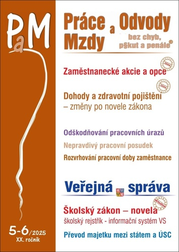Daňové řešení zaměstnaneckých akcií a opcí v roce 2025 – Novelou zákona dochází ke změně ve zdanění příjmu zaměstnance z titulu nabytí zaměstnaneckých akcií. Stávající režim odložení zdanění nabytí zaměstnaneckých akcií zavedený od 1. 1. 2024 lze aplikovat jen dobrovolně. Zaměstnavatel se bude nově bude moci rozhodnout, že bude dobrovolně postupovat podle právní úpravy účinné od 1. 1. 2024. Titul obsahuje: Měsíčník obsahuje aktuální příspěvky doplněné o příklady z praxe a aktuální judikaturu. Je rozdělen na rubriky: Aktuálně, Pracovní právo, Chyby a pokuty, Judikatura, Pracovní cesta, Automobil v podnikání, Odvody, Veřejná správa, Vzory smluv, Výdaje zaměstnavatele, Vedoucí pracovník … - Daňové řešení zaměstnaneckých akcií a opcí v roce 2025 - Dohody a zdravotní pojištění – změny - Pomůže delší zkušební doba? - Krátkodobé zaměstnání - Odškodňování pracovních úrazů - Dovolená je za dveřmi - Dary fyzickým osobám v souvislosti s povodněmi - Student, brigáda v zahraničí a zdravotní pojištění - Řešení použití vozidla zaměstnance k pracovní cestě v roce 2025 - Školský zákon – novela - Nová úprava převodů majetku mezi státem a ÚSC Dlhá anotácia: Daňové řešení zaměstnaneckých akcií a opcí v roce 2025 U akciových společností se můžeme setkat se dvěma druhy specifických zaměstnaneckých benefitů. Jednak jde o poskytnutí akcií společnosti jejím zaměstnancům za zvýhodněných podmínek, a dále o sjednání práva v budoucnosti odkoupit určitý počet akcií společnosti za předem stanovenou cenu (sjednání opce). Novelou zákona dochází ke změně ve zdanění příjmu zaměstnance z titulu nabytí zaměstnaneckých akcií. Stávající režim odložení zdanění nabytí zaměstnaneckých akcií zavedený od 1. 1. 2024 lze aplikovat jen dobrovolně. Zaměstnavatel se bude moci rozhodnout, že bude dobrovolně postupovat podle právní úpravy účinné od 1. 1. 2024, tj. zaměstnavatel zaměstnanci nezúčtuje nepeněžní příjem z titulu nabytí zaměstnaneckých akcií do kalendářního měsíce, ve kterém zaměstnanec akcie získal, ale bude dobrovolně odkládat zdanění tohoto příjmu do budoucna ve smyslu podmínek stanovených v § 6 odst. 14 ZDP. Dohody a zdravotní pojištění – oznamování změn a odvod pojistného Od 1. ledna 2025 se u dohod o pracích konaných mimo pracovní poměr změnily podmínky pro přihlašování a odhlašování osob jako zaměstnanců. Účinnost změn spočívá ve skutečnosti, že pokud se jedná o pracovněprávní vztah sjednaný pouze formou dohody o pracovní činnosti nebo pouze formou dohody o provedení práce, pak zaměstnavatel oznamuje zdravotní pojišťovně nástup zaměstnance do zaměstnání a skončení zaměstnání do 20. dne následujícího kalendářního měsíce. Tento postup platí za podmínky, že výše příjmu zakládá u příslušné dohody povinnost odvodu pojistného na zdravotní pojištění zaměstnavatelem. Další novely školského zákona Novela přináší celkem 26 změn, které nabyly účinnosti dne 1. března 2025, ostatní změny ve školském zákoně nabývat účinnosti až 1. července 2025. Úprava spočívá primárně v zakotvení Informačního systému vzdělávání (ISV). Právní úprava by měla dále reflektovat postupný vznik ISV (připravovaného nejprve v rámci projektu Resortní informační systém ministerstva) jako informačního systému veřejné správy, jehož správcem bude ministerstvo.