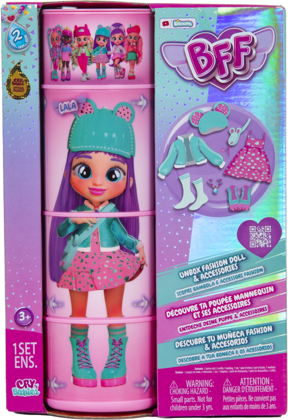 „Cry Babies BFF je sběratelská módní panenka, která ti umožní vyjádřit se, hrát si s módou a ztotožnit se svou oblíbenou postavou z animovaného seriálu Cry Babies Magic Tears. Panenka je vysoká 20 cm, má 15 cm dlouhé, hedvábné nylonové vlasy a spoustu módních doplňků. Tělo panenky má 6 ohebných kloubů pro polohování. Balení je pohyblivé, má otočné válce díky kterým můžeš vidět jak panenka zaujímá různé pózy. Uvnitř balení se nachází panenka a také 9 kusů příslušesntví: 2 kusy oblečení, kabelku, čepici, pár odpovídajíích bot s párem ponožek a náhrdelník!“