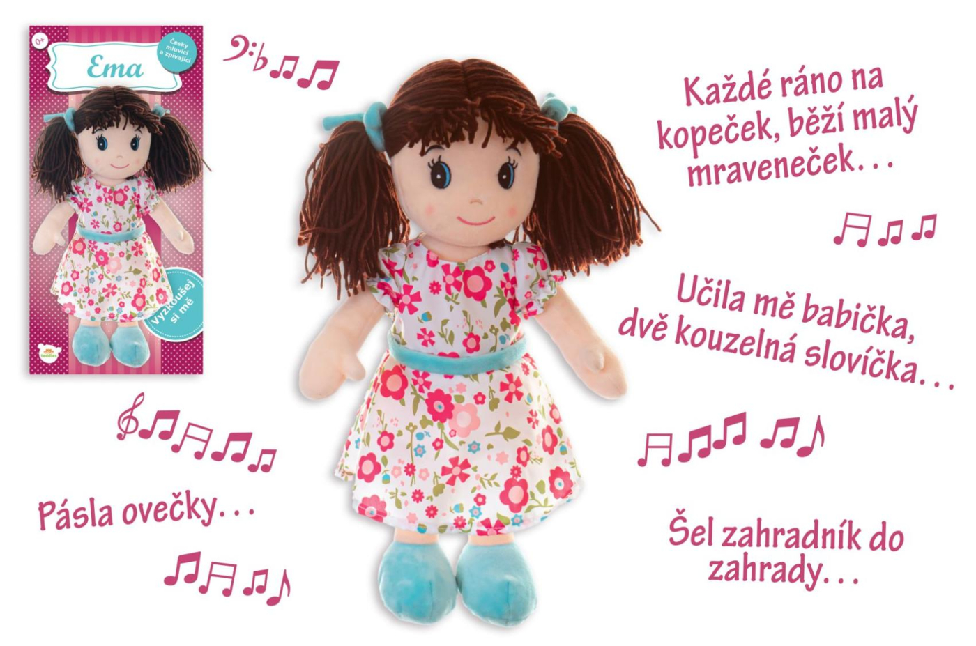 Ema po zmáčknutí bříška říká básničky: Každé ráno na kopeček, běží malý mraveneček... Učila mě babička, dvě kouzelná slovíčka... a zpívá písničky: Pásla ovečky v zeleném háječku... Šel zahradník do zahrady s motykou...