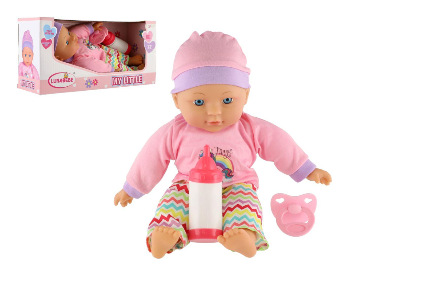 Roztomilá panenka s měkým tělíčkem v krásném oblečku s jednorožcem. Toto miminko udělá jistě radost každé holčičce a stane se tak její nepostradatelnou součástí. Součástí balení je i lahvička a dudlík, které určitě každá maminka pro své miminko nutně potřebuje. Velikost panenky: 30 cm Rozměr balení: 31 x 15,5 x 10 cm