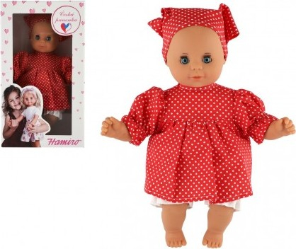 Roztomilé miminko v šatech s šátkem si oblíbí každá malá holčička, která si chce hrát na maminku a starat se o své miminko. Miminko má látkové tělo. Délka 30 cm. V krabici 20x35x13 m.