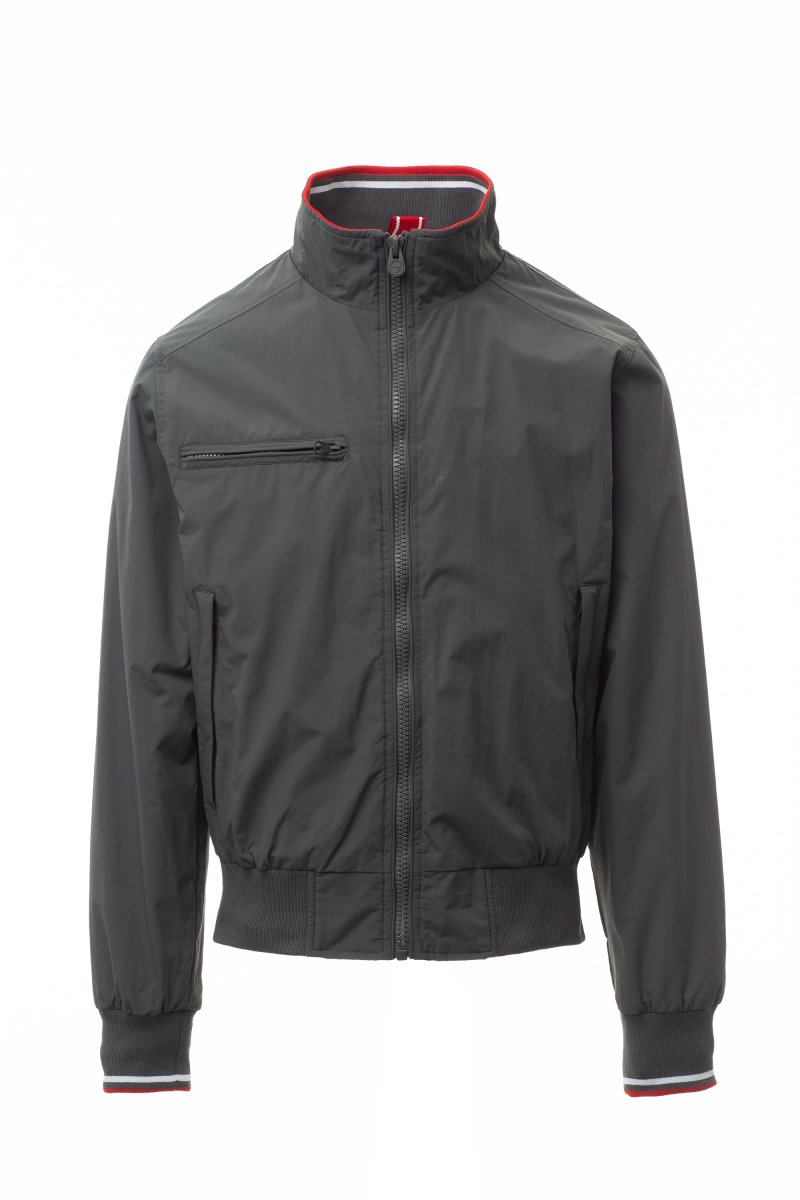 • Pánská lehká bunda s žebrovaným límcem, manžetami a lemem a kontrastním lemem, tři vnější kapsy; podšívka ze síťoviny s jednou kapsou a zipem pro snadnější tisk a vyšívání.