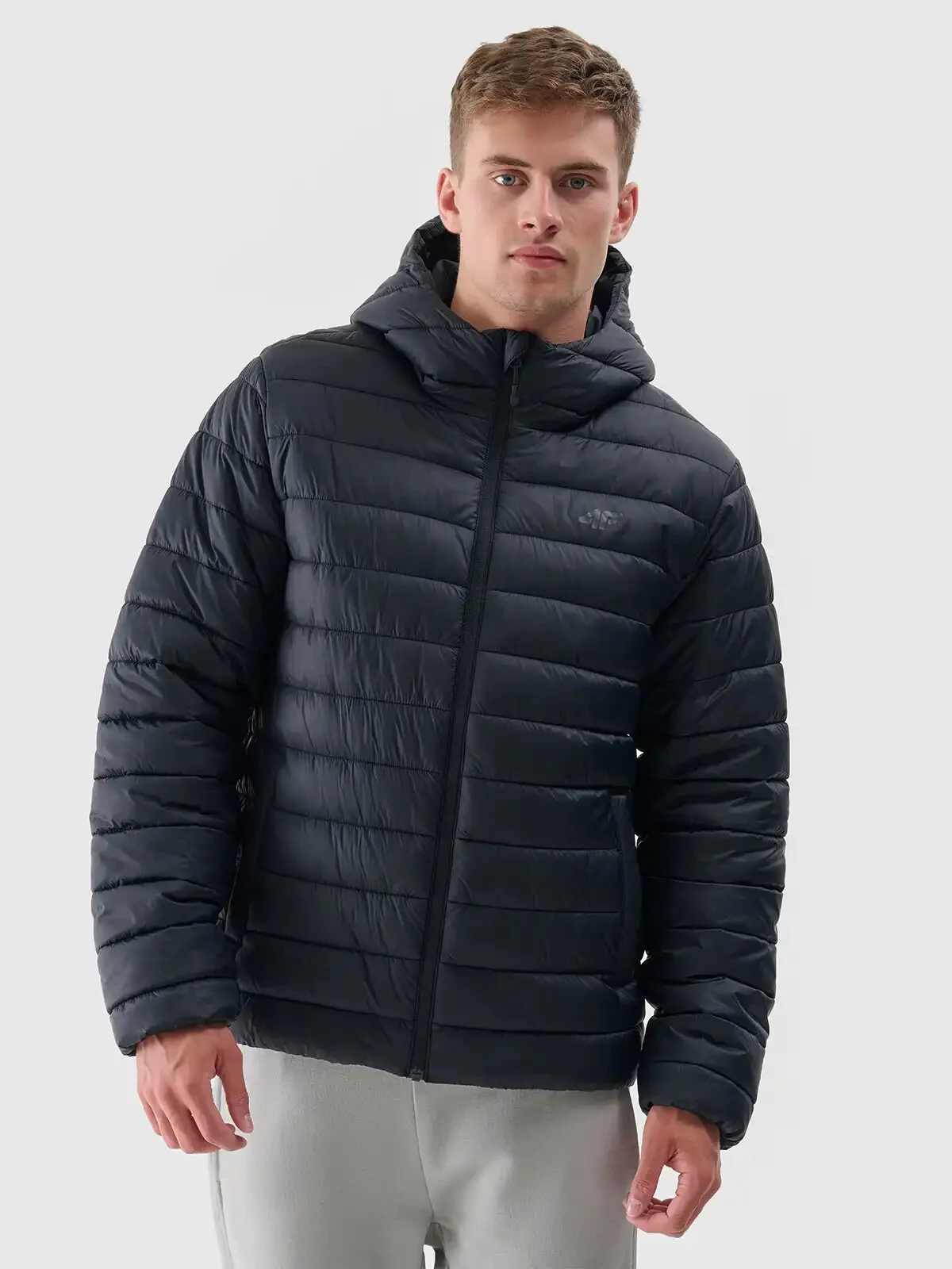 Pánská péřová bunda s nízkým objemem a lehkou výplní s kapucí je ideální volbou pro každodenní i sportovní aktivity v teplejších nebo zamračených dnech v přechodném období. Nejenže chrání před chladem, ale také skvěle funguje jako součást vrstveného oblečení. Bundu lze snadno složit a uložit, takže je pohodlným a praktickým řešením pro různé povětrnostní podmínky. Bunda má klasické horizontální prošívání, které se skládá z rovnoběžných pruhů vedoucích napříč bundou. Tento druh prošívání zajišťuje dobrou tepelnou izolaci a dostatečnou kompresi bundy. Má střih regular, který se pohodlně přizpůsobí postavě a standardní délku sahající k linii boků. Výplň v podobě syntetického peří je odolnější a snadněji se udržuje než přírodní peří. I když je vystavena vlhkosti, déle si zachovává své izolační vlastnosti a mnohem rychleji schne. Navíc nevyžaduje složité praní a sušení. Podíl suroviny získané v recyklačním procesu je 100%, což potvrzují nezávislé certifikační orgány nebo licence. Funkční řešení pro maximální pohodlí díky hydrofobní impregnační vrstvě a technologii 4FWarm. Pánská péřová bunda s kapucí je vybavena integrovanou kapucí bez možnosti regulace. Krk je chráněn nízkým stojáčkem. Rukávy s manžetami zakončenými elastickou gumou. Na bocích jsou 2 otevřené kapsy. Zatímco na vnitřní straně je kapsa se zapínáním na zip, která umožňuje bezpečně přenášet cenné předměty, např. telefon. Pánská péřová bunda se zapíná na jednosměrný hlavní zip a je vybavená vnitřní větruodolnou légou, která omezuje pronikání chladu dovnitř bundy. Spodní část s elastickou gumou.