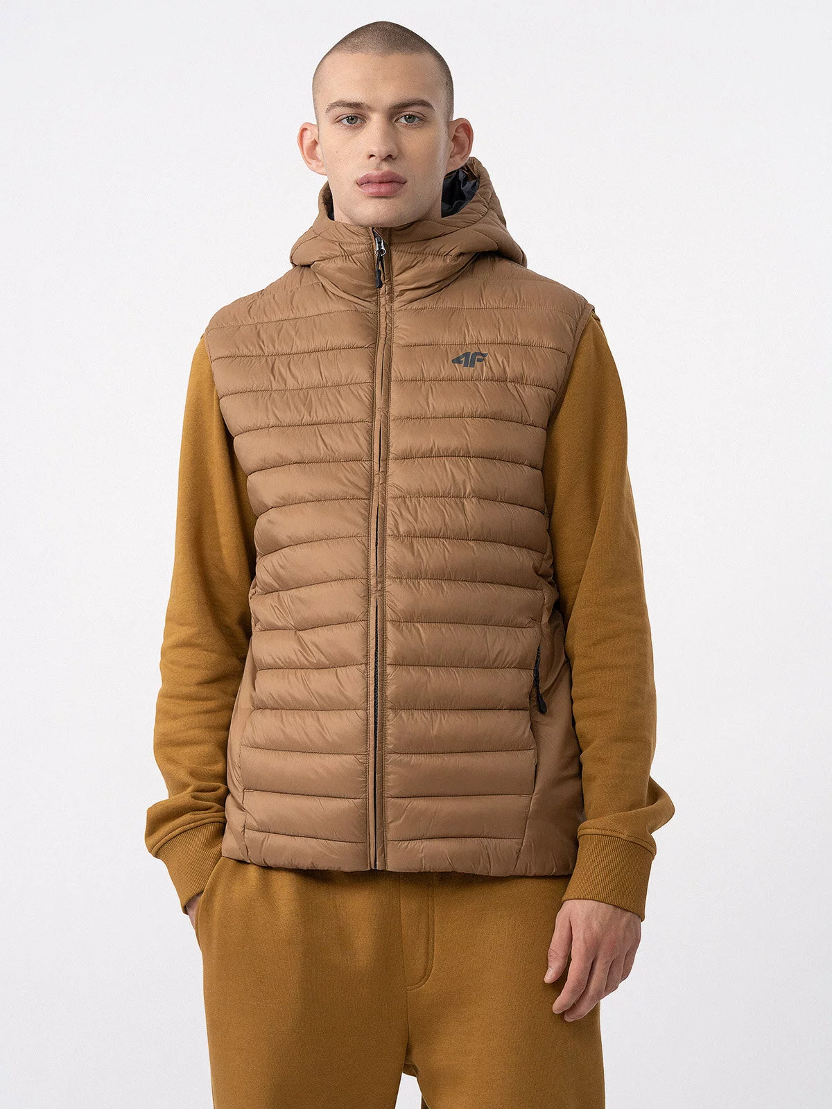Pánská prošívaná vesta 4F. Vyplněna lehkým syntetickým peřím, které zajistí pohodlí při každodenních aktivitách. Vnější materiál vybaven hydrofobní impregnací, která zpomaluje absorpci vlhkosti. Vesta má také pohodlnou kapuci s vysokým stojáčkem, který vás ochrání před větrem a kapsy, do kterých si můžete uložit drobnosti.bez podšívkyboční kapsy se zapínáním na zipnenastavitelná kapuce umístěná na vysokém stojáčkuelastická spodní část s gumouhydrofobní impregnace materiálu omezuje absorpci vnější vlhkostihlavní zip s vnitřní větruvzdornou légou zakončenou ochranou bradyvýplň ze syntetického peří zajistí optimální tepelný komfort během používání.