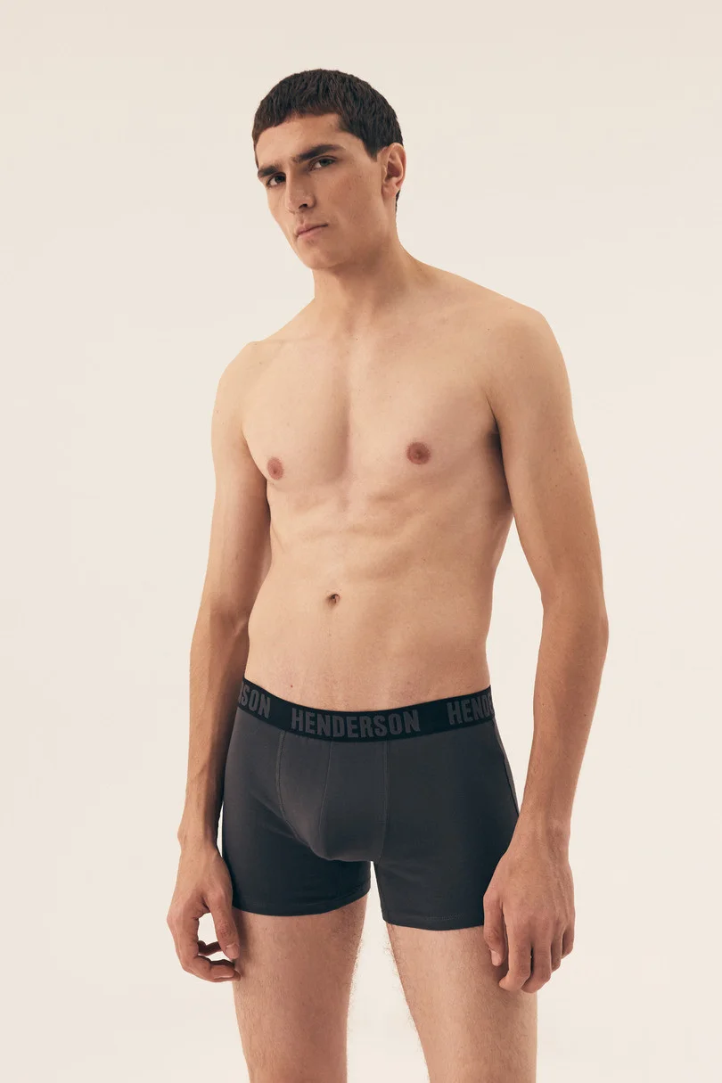 Bokserki męskie wykonane z wysokiej jakości bawełny. W pasie szeroka guma z logo firmy. Nogawka średniej długości (medium leg). Pakowane w pudełko po pięć sztuk: czarny i grafitowy. Skład: 95% Bawełna, 5% Elastan.