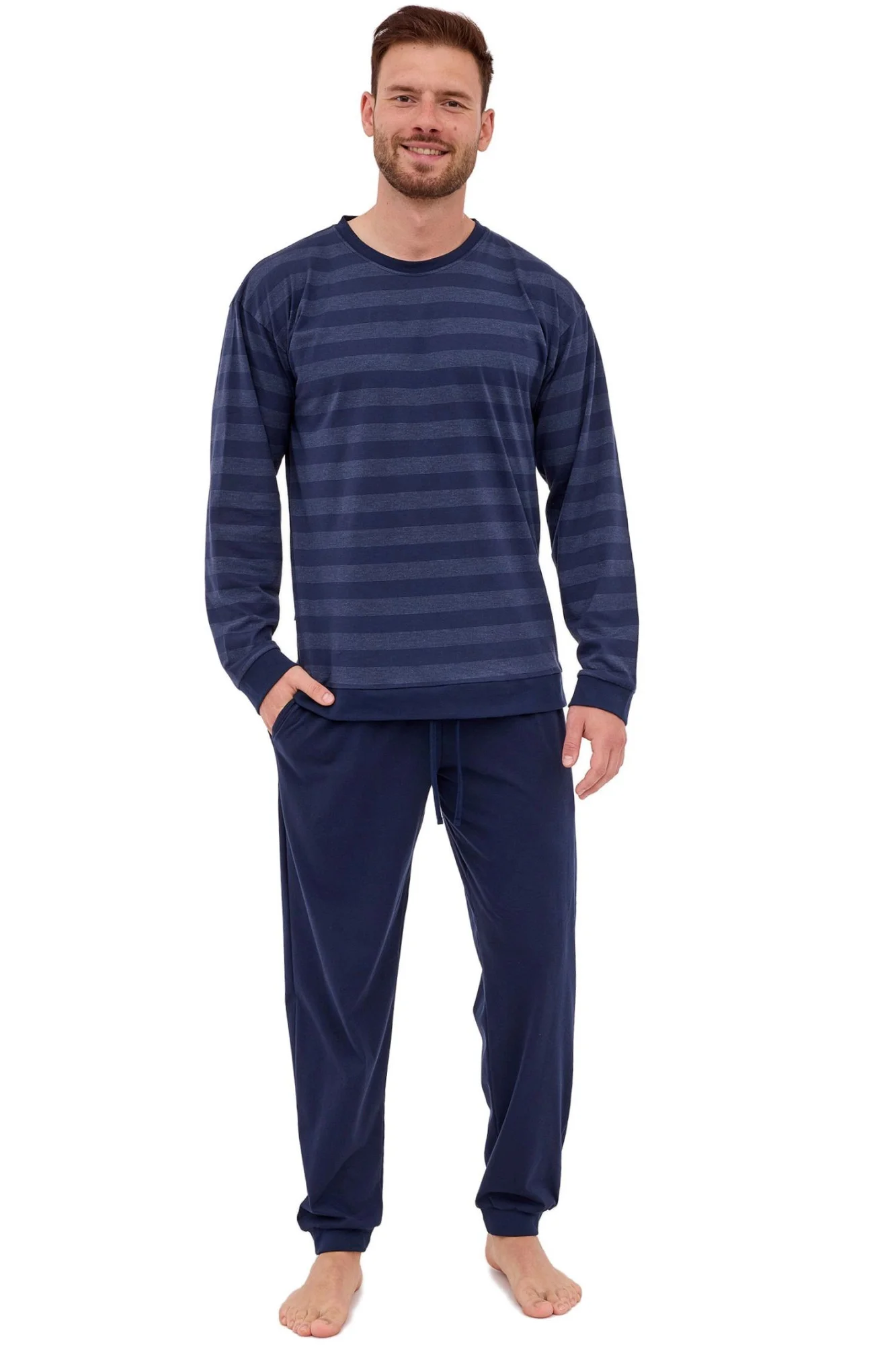 Pánské pyžamo 117/279 Loose CORNETTE - z vysoce jakostní bavlny - tmavě modré tričko s dlouhými rukávy - zdobené pruhy - pohodlné jednobarevné dlouhé kalhoty s kapsamiMateriálové složení: 100% bavlna Velikosti pro muže S M L XL XXL 3XL 4XL 5XL Obvod hrudníku (cm) 92-96cm 96-100cm 100-104cm 104-108cm 108-112cm 112-116cm 116-122cm 122-128cm Obvod pasu (cm) 82-86cm 86-90cm 90-94cm 94-98cm 98-102cm 102-106cm 106-112cm 112-118cm Výška (cm) 164-170cm 170-176cm 176-182cm 182-188cm 188-194cm 188-194cm 188-194cm 188-194cm Velikosti pro ženy S M L XL XXL 3XL 4XL 5XL Obvod hrudníku (cm) 88-92cm 92-96cm 96-100cm 100-104cm 104-108cm 108-112cm 112-118cm 118-124cm Obvod pasu (cm) 72-76cm 76-80cm 80-84cm 84-88cm 88-92cm 92-96cm 96-102cm 102-108cm Obvod boků (cm) 92-96cm 96-100cm 100-104cm 104-108cm 108-112cm 112-116cm 116-122cm 122-128cm Výška (cm) 158-164cm 164-170cm 164-170cm 170-176cm 176-182cm 176-182cm 176-182cm 176-182cm Dětské velikosti (roky) 2-3 3-4 5-6 7-8 9-10 11-12 13-14 Obvod hrudníku (cm) 50-54cm 54-58cm 58-62cm 62-66cm 66-72cm 72-80cm 80-88cm Obvod pasu (cm) 48-52cm 50-54cm 52-56cm 54-58cm 56-62cm 60-68cm 64-72cm Výška (cm) 86-92cm 98-104cm 110-116cm 122-128cm 134-140cm 146-152cm 158-164cm