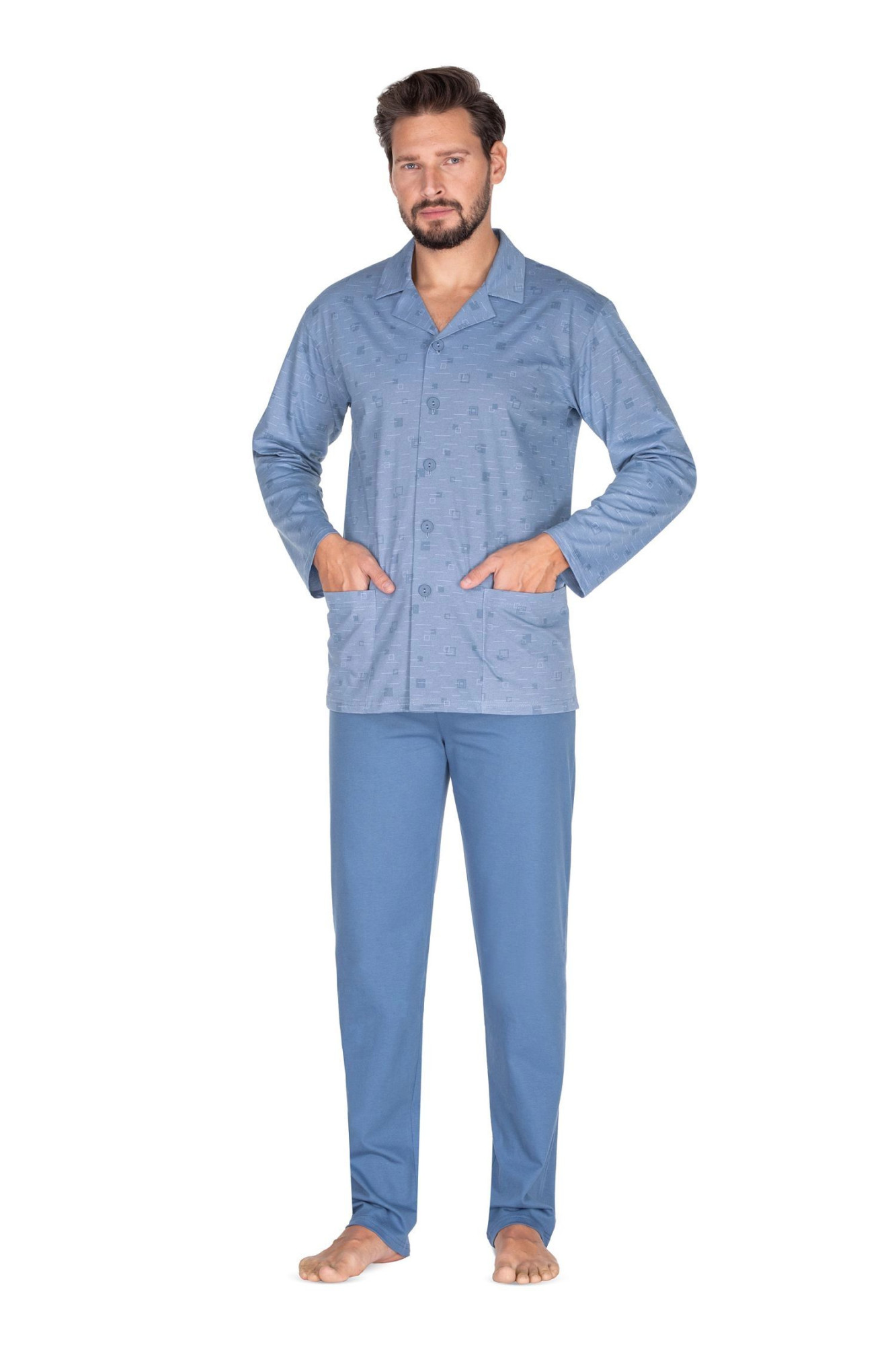 Pánské pyžamo 444 light blue REGINA - z vysoce jakostní bavlny - světle modrá košile s dlouhými rukávy - se vzorem - se zapínáním na knoflíky - na bocích kapsy - pohodlné dlouhé světle modré kalhotyMateriálové složení: 100% bavlna Velikosti pro ženy S M L XL 2XL 3XL 4XL Obvod hrudníku (cm) 84cm 90cm 96cm 102cm 108cm 116cm 124cm Obvod boků (cm) 91cm 96cm 102cm 107cm 113cm 120cm 128cm Výška (cm) 160cm 164cm 168cm 168cm 164cm 164cm 164cm Velikosti pro muže M L XL 2XL 3XL Obvod hrudníku (cm) 100cm 104cm 108cm 112cm 122cm Obvod boků (cm) 90cm 94cm 98cm 104cm 114cm Výška (cm) 172cm 178cm 182cm 184cm 184cm