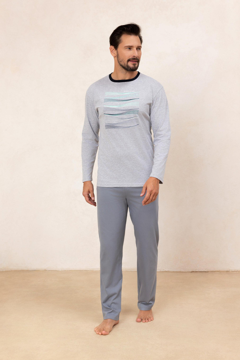 Pánské pyžamo 492 J/25 je klasikou od společnosti Regina, která je navržena pro maximální pohodlí a jednoduchý, elegantní styl.Tričko s dlouhými rukávy je vyrobeno z vysoce kvalitní 100% bavlny, má kulatý výstřih a minimalistický potisk na úrovni hrudníku.Komplet je doplněn dlouhými pevnými kalhotami pro pohodlné celonoční nošení.Je to ideální volba pro muže, kteří hledají klasiku a kvalitní materiályóv nočním oblečení.