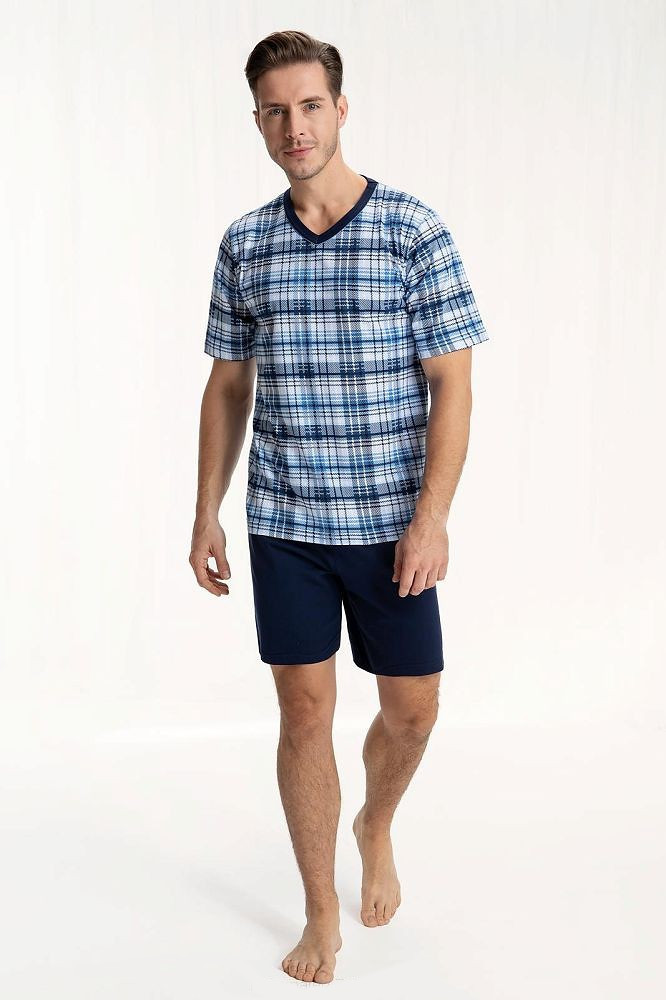 Pánské pyžamo, které je vyrobené z velmi kvalitní, stoprocentní bavlny. Vzorovaná blůza pyžama má krátké rukávy a výstřih ve tvaru písmene "V". Komplet doplňují volné jednobarevné kraťasy. Náhodný výběr vzorů, potisk.
