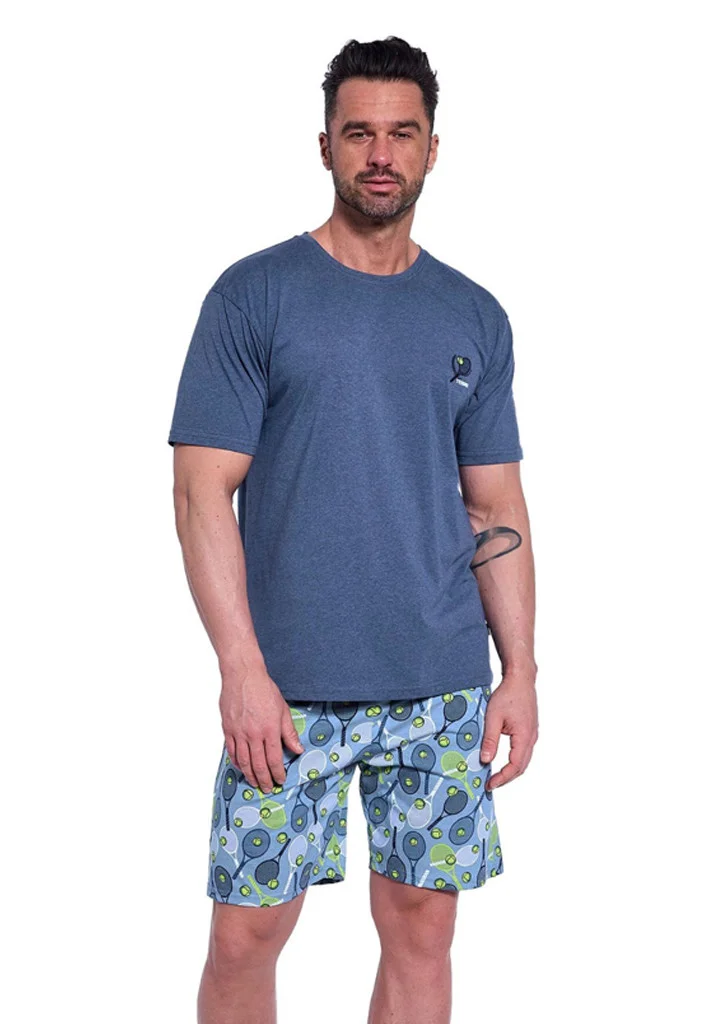 Pánské pyžamo CORNETTE je vyrobeno z vysoce kvalitní bavlny a nabízí maximální pohodlí během spánku i odpočinku. Součástí je džínově modré tričko s krátkými rukávy, půlkulatým výstřihem a stylovým potiskem na přední straně. Pyžamo doplňují pohodlné vzorované kraťasy, které ladí s celkovým sportovně-ležérním vzhledem. Materiálové složení: 100% bavlna.