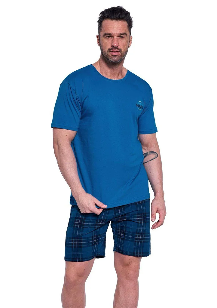 Pánské pyžamo Cornette je vyrobeno z vysoce kvalitní bavlny a nabízí pohodlí i styl pro každodenní nošení. Pyžamo tvoří světle modré tričko s krátkými rukávy, půlkulatým výstřihem a stylovým potiskem na přední straně. Součástí jsou také pohodlné kraťasy s moderním károvaným vzorem. Ideální volba pro muže, kteří ocení kvalitní materiál a promyšlený design. Materiálové složení: 100% bavlna.