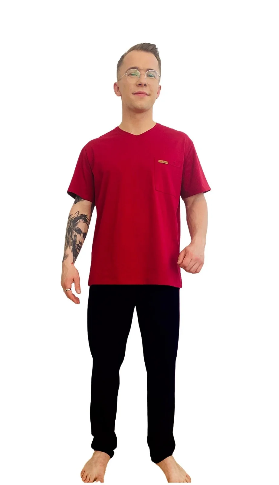Pánské pyžamo. Blůza pyžama má krátké rukávy, výstřih ve tvaru písmene "V" a je ozdobená kapsičkou. Komplet doplňují dlouhé jednobarevné kalhoty. Složení: 95 % bavlna, 5 % elastan.