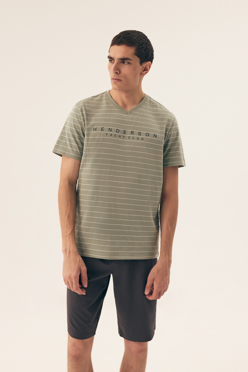 Pánské pyžamo z bavlny. Měkce pruhované úpletové tričko, výstřih. Kalhoty z tenké bavlněné tkaniny, hladké. Délka ke kolenům. V pase guma a šňůrka pro nastavení obvodu pasu. K dispozici ve dvou barevných variantách. Složení: 100% bavlna. .