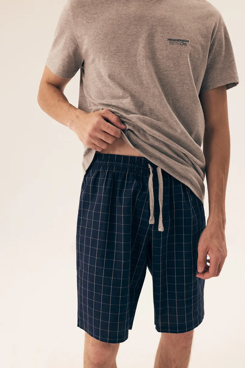 Piżama męska wykonana z bawełny, melanżowa koszulka z dzianiny. Dekolt w szpic, krótki rękaw z przodu mały nadruk. Do kompletu spodnie z cienkiej tkaniny bawełnianej w kratkę. Długość do kolan. W pasie guma i sznurek do regulacji obwodu pasa. Skład: Koszulka 88% Bawełna, 12% Poliester; Spodnie 100% Bawełna